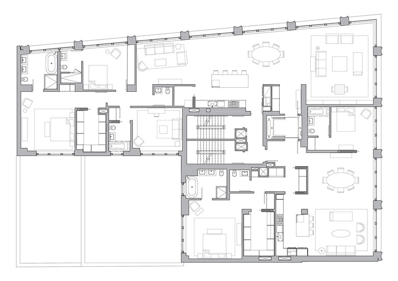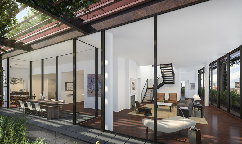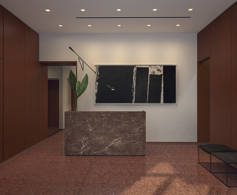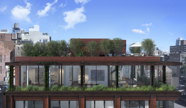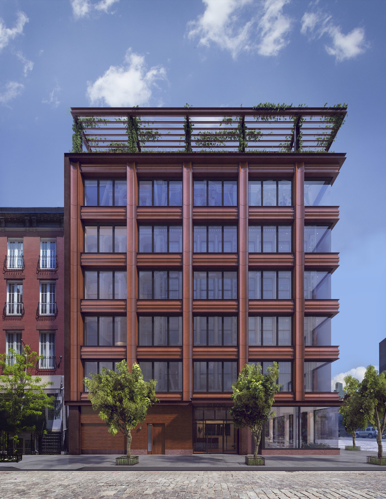 The new condominium is located at the corner of Lafayette and Bond Street in New York’s NoHo neighborhood, a district characterized by loft buildings with a high level of craftsmanship. The design for this 34,000 sf building is a contemporary reflection of the neighborhood’s architectural traditions with a sculpted terracotta façade and weathered steel details. The seven story building contains eleven units: ten, two or three bedroom units and a penthouse with a large trellis-covered terrace. Retail shops and an entrance lobby are located on the ground level, which is distinguished by a façade of rich mahogany, slate, and glass.