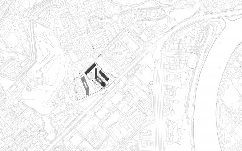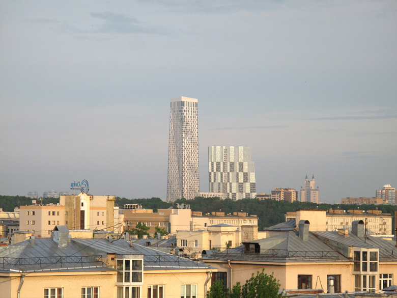 The Dwelling complex is located very closely to the wide open spaces of Poklonnaya Gora and the valley of the Setun River. Its composition was dictated by existing urban situation and originally consisted of two symmetrical pairs slightly differing from each other. The first part of this pair is nearing its completion now. It was conceived and constructed as general urban accent just for the purpose of versatile apprehension from well known observation points in Moscow. The place for construction site was chosen on the top break point of the longitudinal profile of the famous street in the city. The spot of the complex itself managed to occupy only vacant spaces within city blocks and not a single existing house in the area had been touched. The skyscraper`s architecture responds to the scarceness of buildings in the district, famous for the rich greenery of Moscow State University campus and vast territories of well-known "Mosfilm" factory of movies. The main tower serves as a landmark of the main entrance to it.