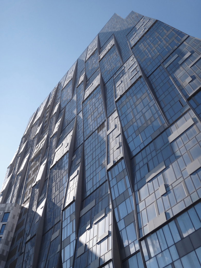 To stress the size of the main tower the 8-shade colored façade "alpolic" panels were used, smoothly changing from as brightly white as Carrara marble at the top to dark shades of limestone at the bottom. The "alpolic" panels (Japan) are the finishing element of suspended façade system assembled in modules, making a sure impression of the building faced with natural stone material. Rhombus shaped plan of each typical floor is slightly but intentionally turned counterclockwise with each level from bottom to top thus giving the main tower a twisted shape, when obtuse angle on the first floor changes itself to a sharp one at the very top, and vice versa. The panel-shaped high-rise building is very sculptural as well because its facades are made of three different types of glass while its monotony gets subdued by the intertwined basket-like vertical stripes.