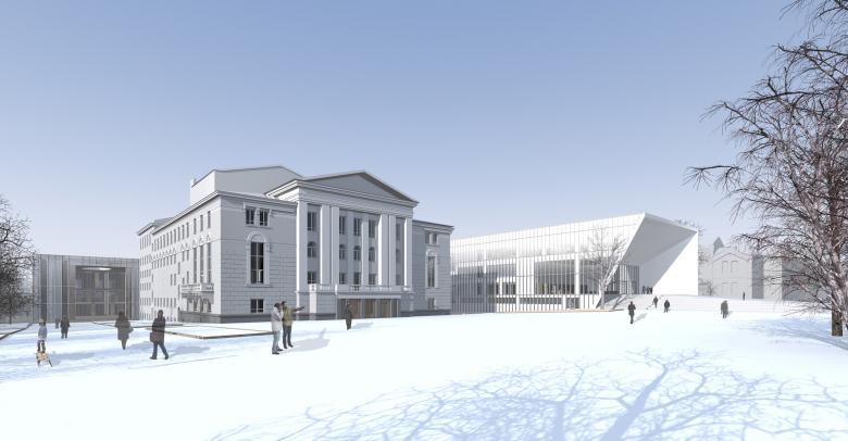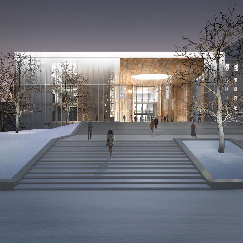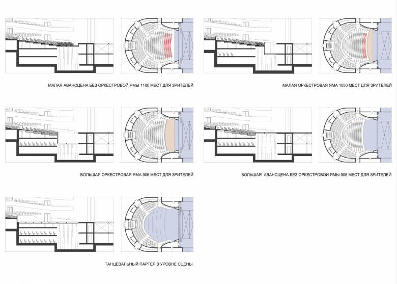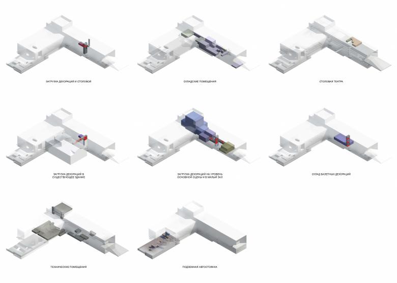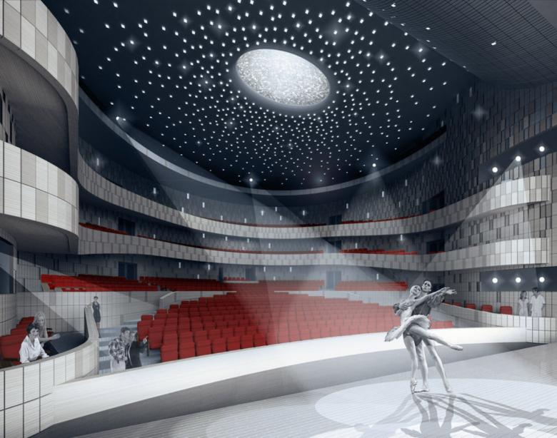 The main effort in the work out process to prepare the competition offer was concentrated on the attempt to create a theatre machine. The second half of our concept rested upon necessity to meet the client`s demand to find an optimal solution in using both Old and New stages of the theatre. The search for functional practicability was the key principle reflected in our final version of the project. The next thing of primary importance which we felt obliged to observe in our work carefully was continuity and very smooth development.