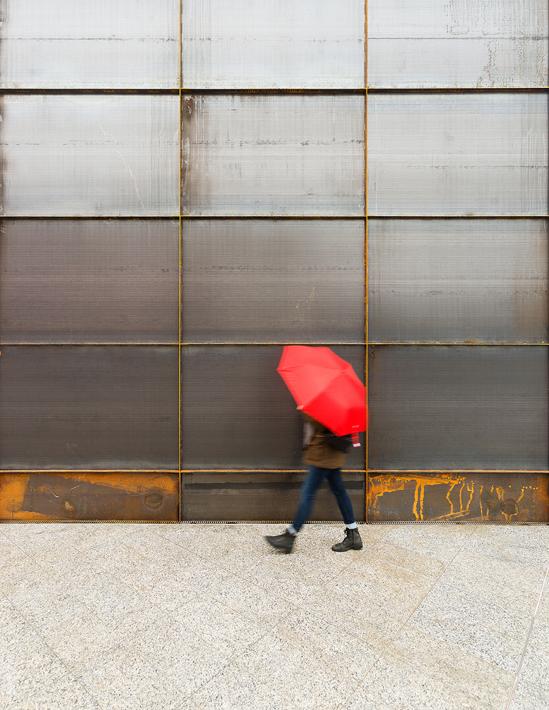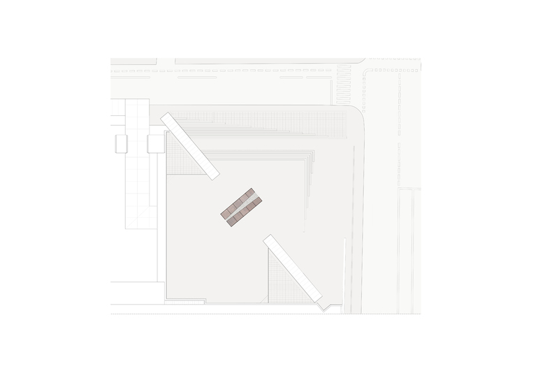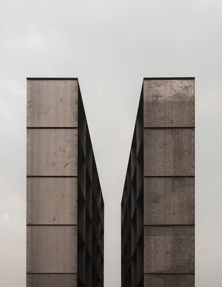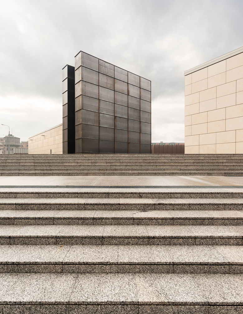 located at the intersection of Via dé Carracci and Ponte Matteotti, a city square encompassed by the newlyinstalled high-speed train station of Bologna. This area is primed to become the new connective pole of the city. As such, the monument attracts passers-by, inviting them to reflect on the tragedy of the Holocaust. The Memorial is made up of two symmetrical cor-ten steel parallelepiped blocks of 10x10m each; the blocks sit adjacent to one another, perpendicular to the existing walls of the square. Their position converges to create a path, which begins with a width of 1.60m, drastically narrowing to just 80cm. The path generates an immediate feeling of oppression. At the interior of the Memorial, the volumes present a grid of horizontal and vertical metal sheets which intersect at 90°, giving shape to a series of rectangular empty boxes of 1.80 x 1.25m – these boxes represent the cells of the dormitories in the concentration camps. The exterior façade of the Memorial
