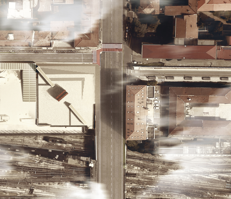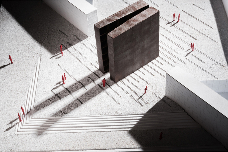 overlooks the city, resembling a blank page – perhaps it is of a history yet to be written? And, along the perimeter of the cells, slight steel protrusions symbolize feelings of contemporary awareness. The choice of cor-ten steel is deliberate: it is a material that will naturally rust when exposed to open air. As the years pass its corrosion will display the vestiges of time, demonstrating that all things have a rich history behind them. The paving of the path between the two blocks is realized in ballast, basalt stone chippings typical of the roadbeds. This represents the Judenrampe (“ramp of the Jewish”), which was the name given to the trek prisoners made from Auschwitz I (Stammlager concentration camp) and Auschwitz II (Birkenau
