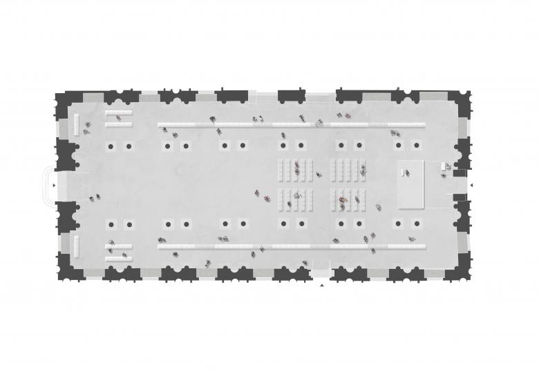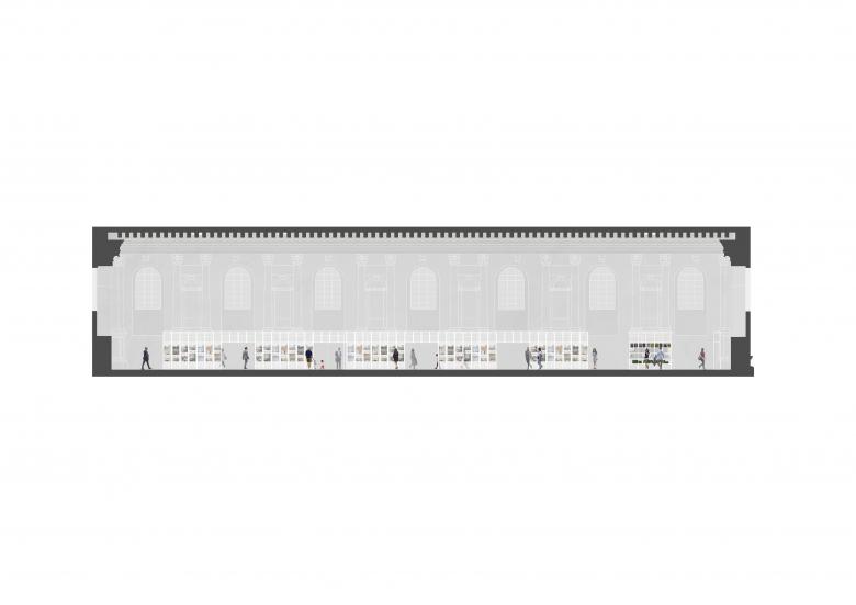 The key theme of the project is seriality. The large number of projects to be exhibited is emphasized by the repetition of the elements with a rhythm capable of bringing the installation into an abstract dimension. The positioning of the installation in the center of the two side spans allows the display of the projects on both fronts generating a fluid and dynamic circulation.