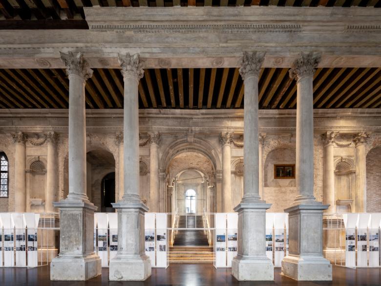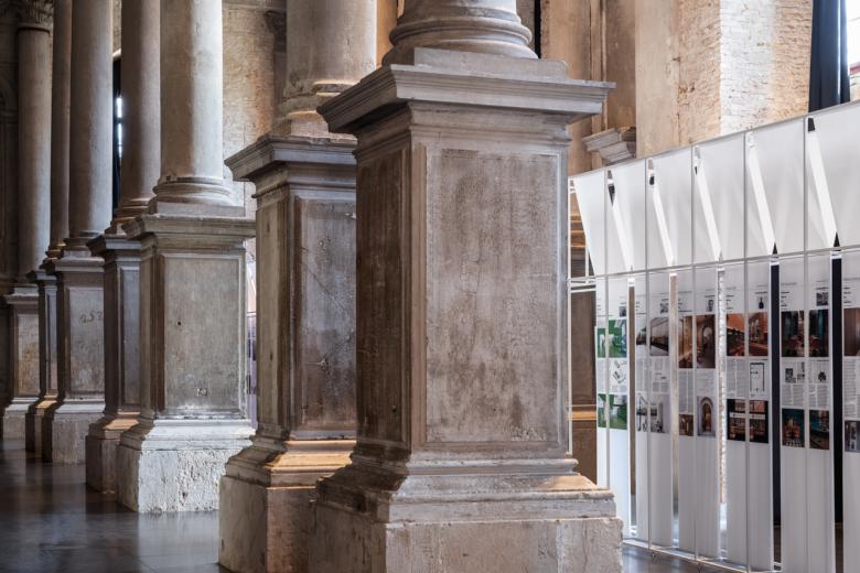 The height of the installation reflects the height of the base of the pre-existing columns, creating a direct relationship with the context, between the heaviness of the stone and the lightness of the exhibition structure.