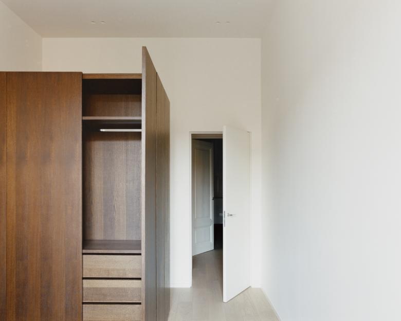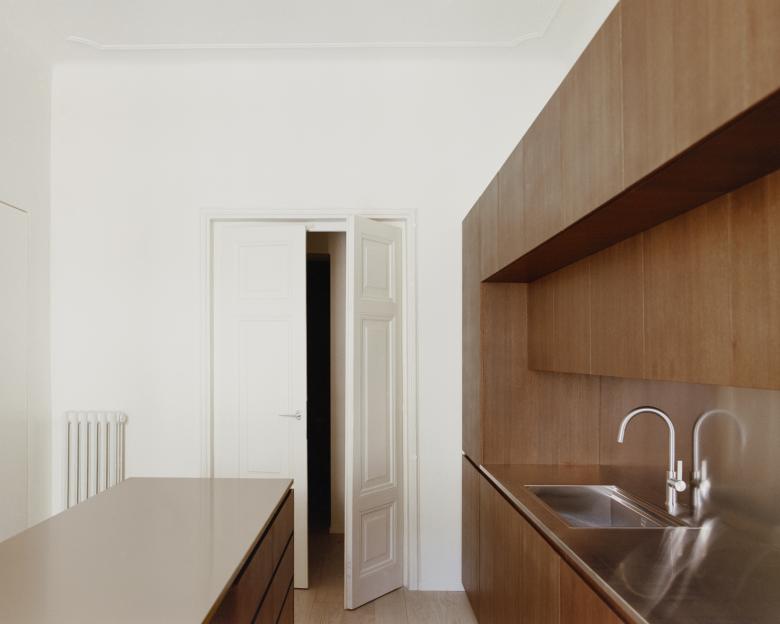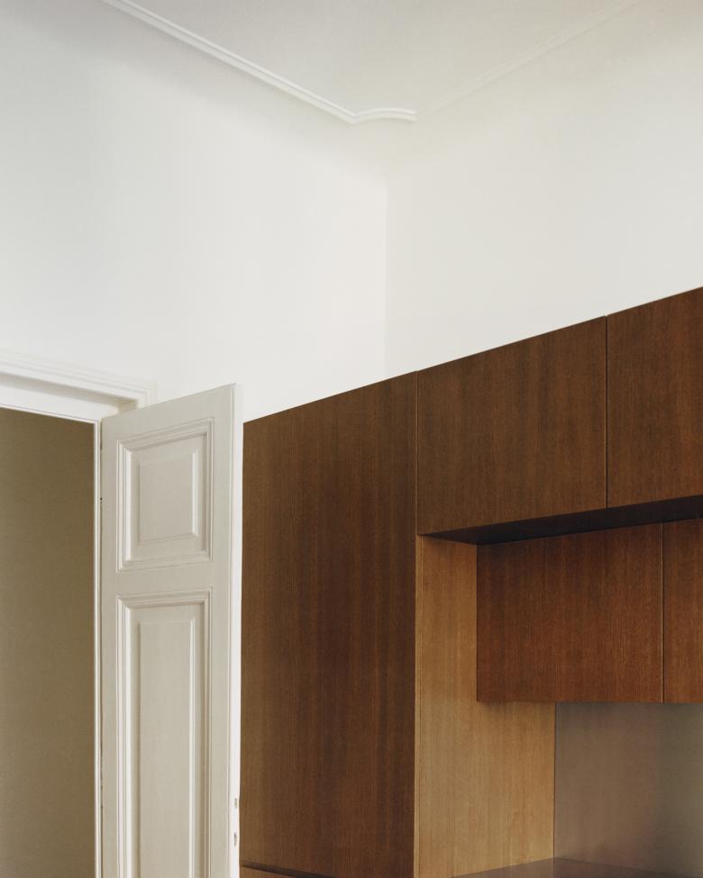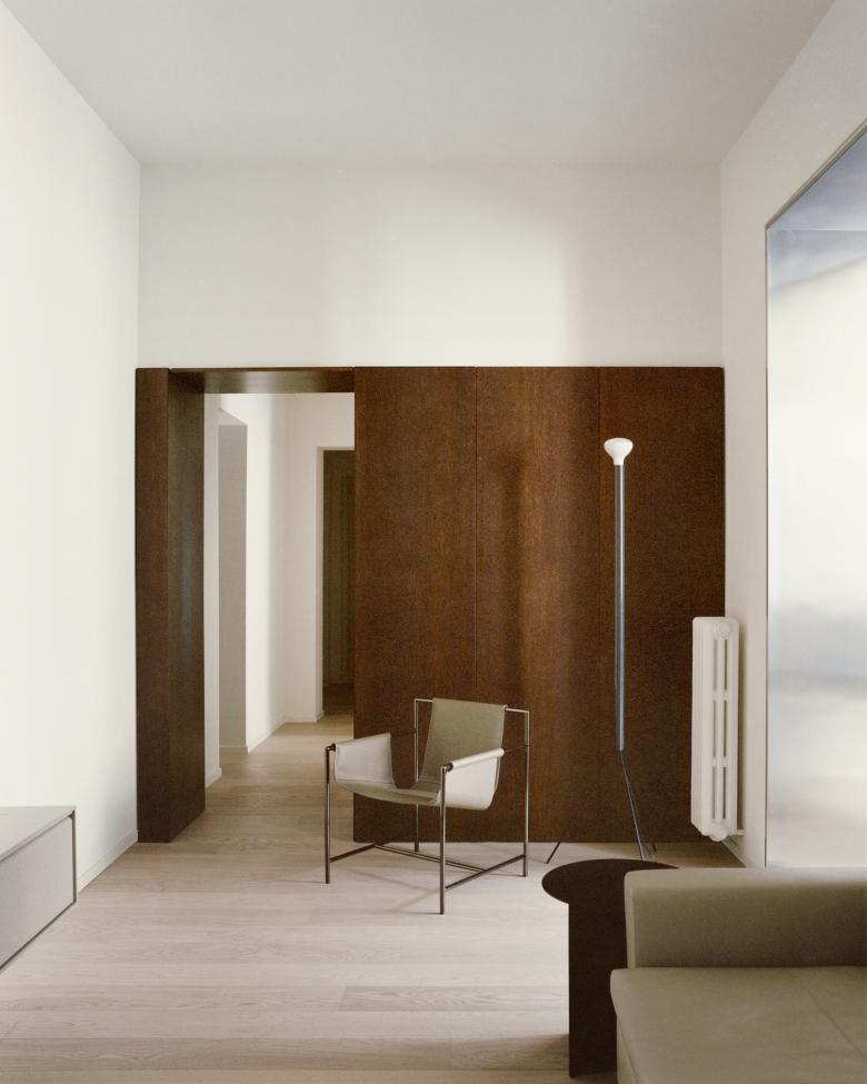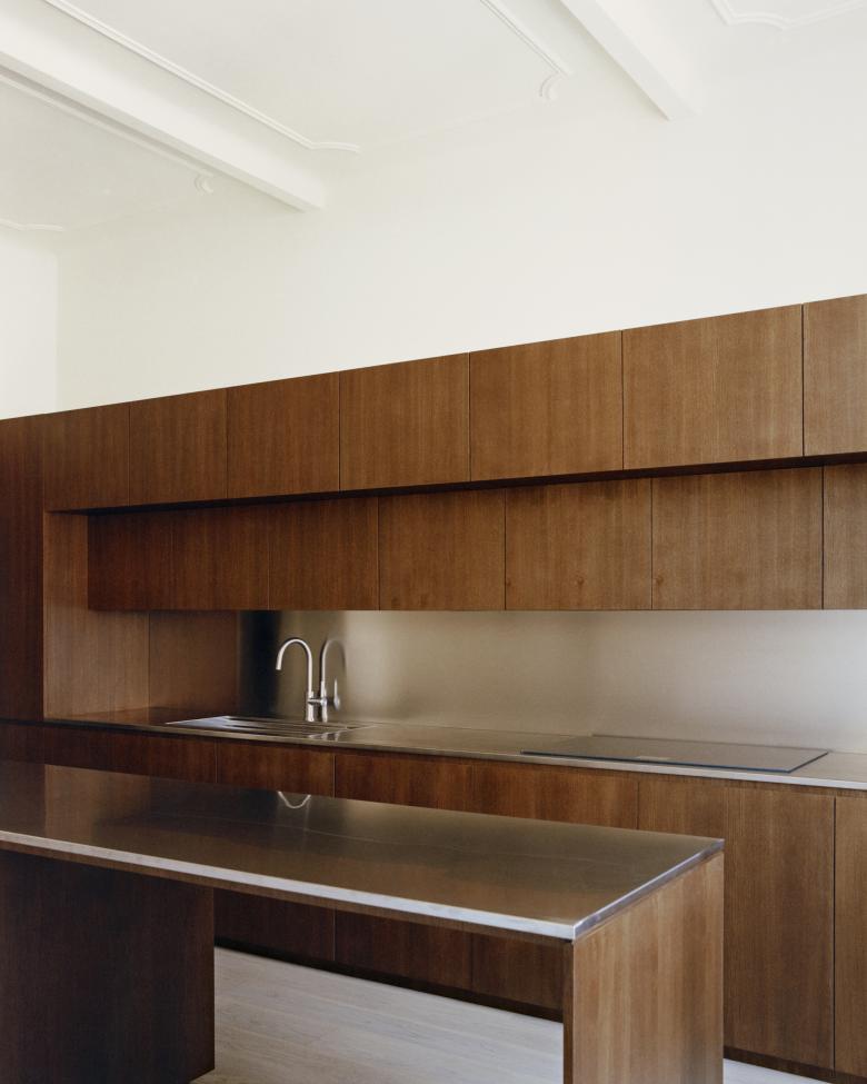 The design solution was to use dark walnut wood as the common thread of the entire project, creating a domestic infrastructure based on a system of custom-made furnishings such as wardrobes, boiseries, kitchen, bathoroom cabinets, etc.