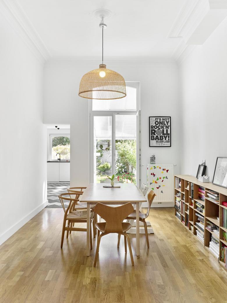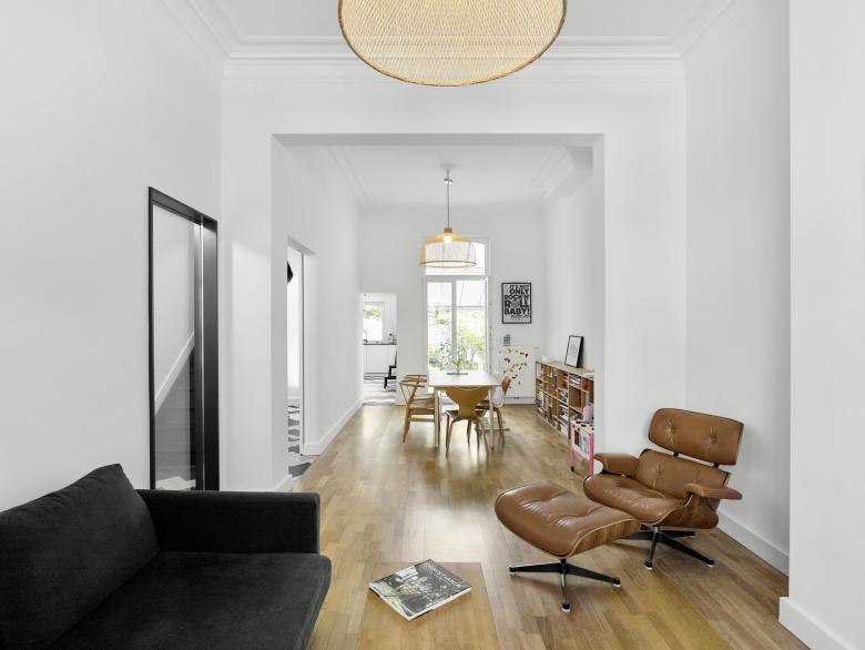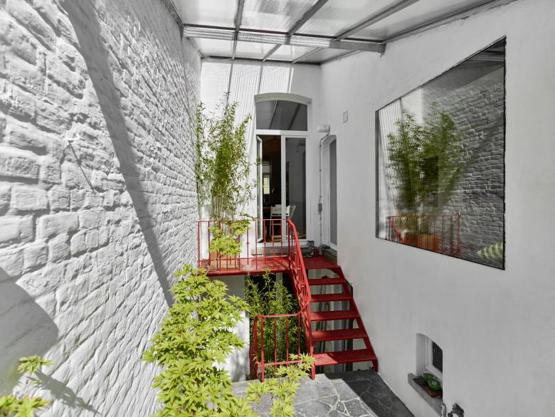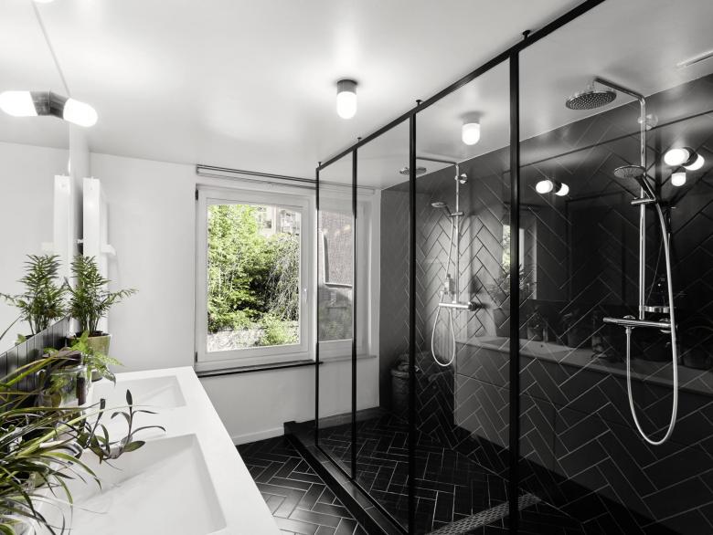 Complete renovation and refurbishment of a 19th Century house in Brussels, Belgium. The clients - a family with children - wanted the design to reflect their passion for colours, light and space. Black and white graphic pattern tiling was added throughout the ground floor level, with sliding and glass doors maximising the natural light and available space. In the kitchen a custom picture window/bench brings the outdoors - indoors. Colour is used innovatively with a dark paint bringing focus to the original feature staircase while on the upper level bright painted floors create contrast between rooms. In the bathroom a new double walk-in shower and black herringbone tiling transforms the space.