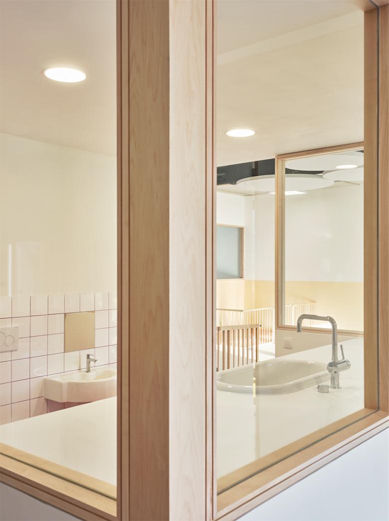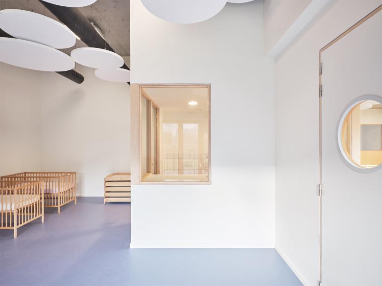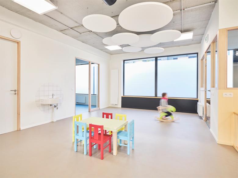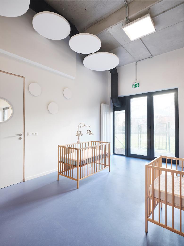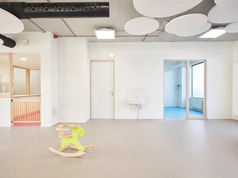 Creation of a day care centre/creche in Brussels, Belgium. Adaptive re-use of a premises keeping the industrial integrity. Coloured flooring and glazed panels zone the space while maximising natural light and visibility. Audio reducing discs on ceilings and walls and natural hued paint colours create a sense of calm.