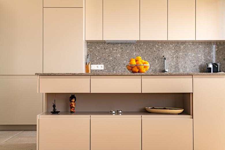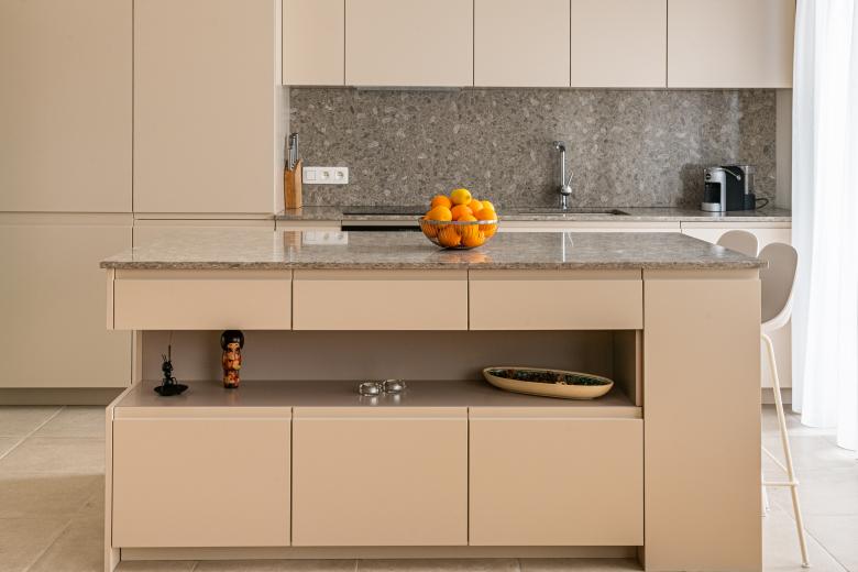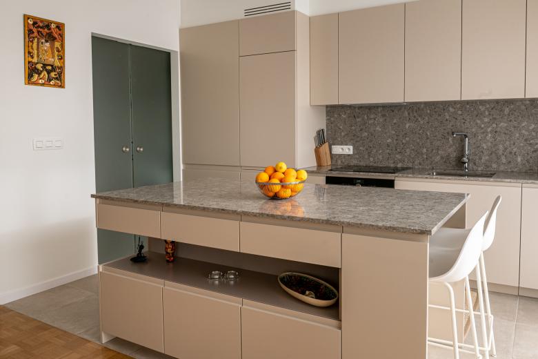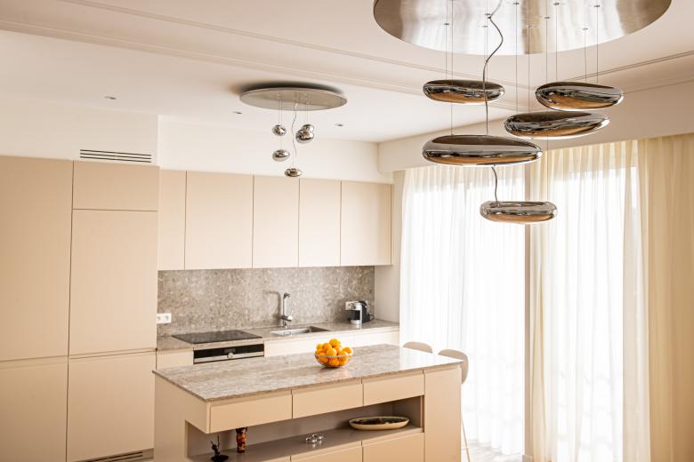 Renovation and space re-design of family apartment in Brussels, Belgium. Creation of a kitchen/living space with a new minimalist kitchen, a utility area screened behind frosted glass doors and statement light fittings.