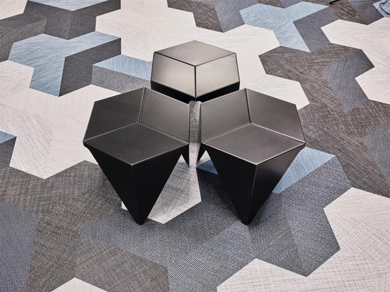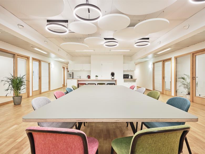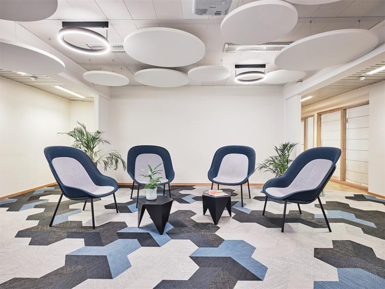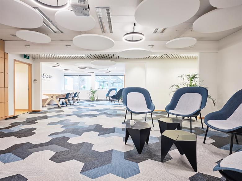 Space re-design and refurbishment of Oslo Region Workspace in the European Parliament, Brussels. Communication of Oslo Region's brand through the space with a logo wall mural, carpet mosaic and furnishing in complimentary colours. Commission/design of custom furniture for reception table and kitchen/coffee bar area.