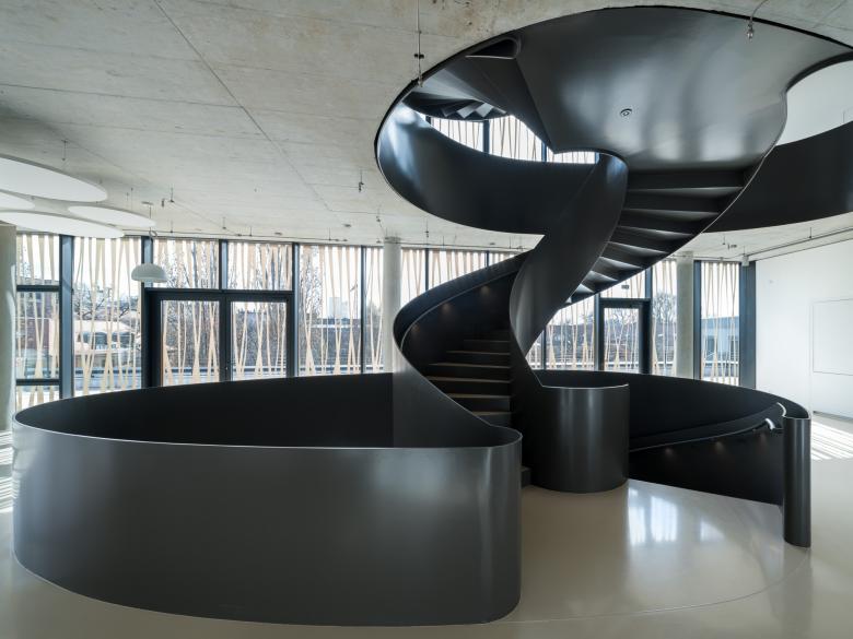 Die Grundrissstruktur des Institutsgebäudes trägt der interdisziplinären Arbeitsweise und der gewünschten Kommunikation zwischen den wissenschaftlichen Arbeitsgruppen Rechnung. Ein alle Geschosse verbindender Luftraum mit skulpturaler Wendeltreppe stellt das prägnante Zentrum des Gebäudes dar, das der Erschließung und der Orientierung dient und als interner Treffpunkt zur Kommunikation einlädt. Hier liegen die Besprechungs- und Aufenthaltsräume sowie die Teeküchen. Da die Wissenschaftler programm- und disziplinübergreifend forschen und sowohl experimentelle als auch mathematische An- sätze verfolgen, kommen im Institut klassische experimentelle molekularbiologische Laborarbeitsplätze mit rechnerintensiven bioinformatischen und theoretischen Arbeitsplätze zusammen, wobei die Anteile der jeweiligen Arbeitsplätze je Arbeitsgruppe variieren und flexibel anpassbar sind.