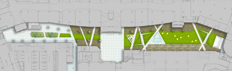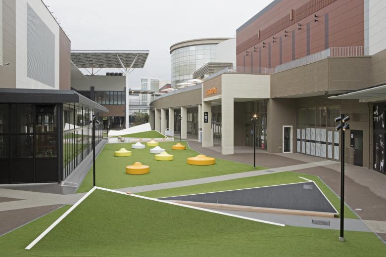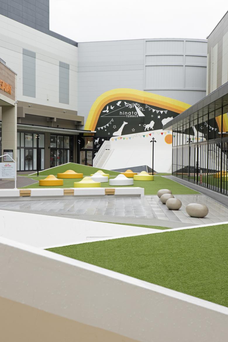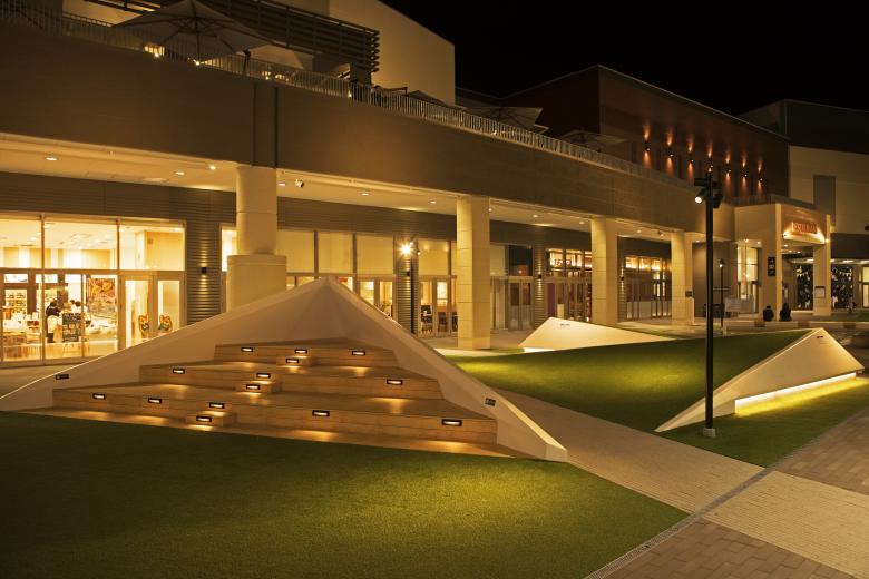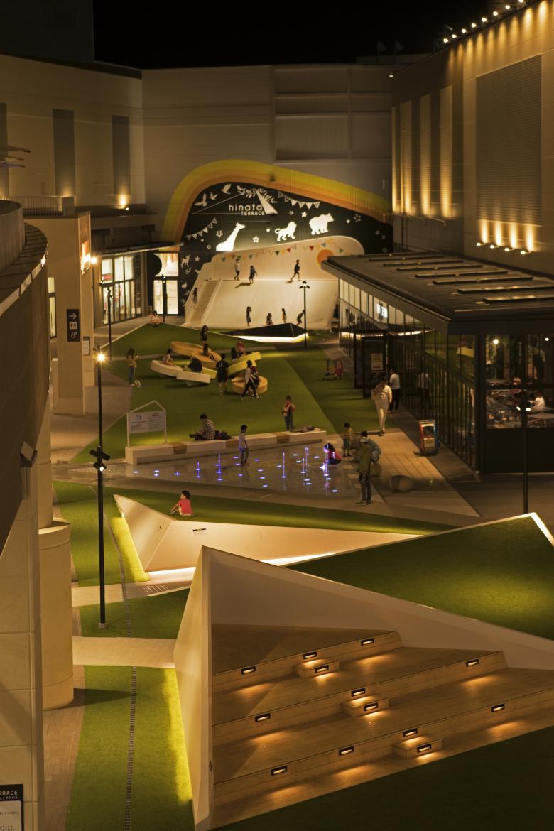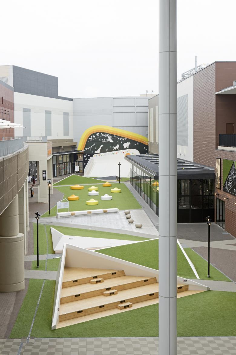Sections of the lawn are raised at an angle like a mound, and they can be used for people to stretch out and relax, or to view various activities inside and outside of the stores.