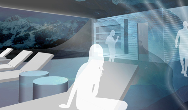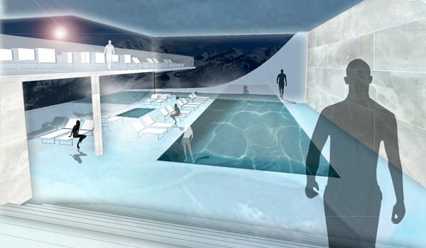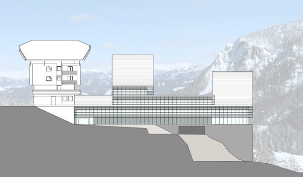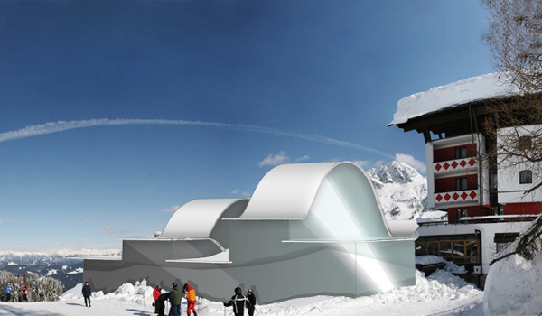 Wettbewerbsentwurf, 2.Preis, für ein privates Ferienhotel am Nassfeld. Die gebauten, begehbaren “Schneewehen” lassen das Hotel als Landart erscheinen und wirken der weiteren Zersiedelung des Skigebietes entgegen. Umfang: ca.60 Zimmer, Spa-Bereich, Restaurant,Bar