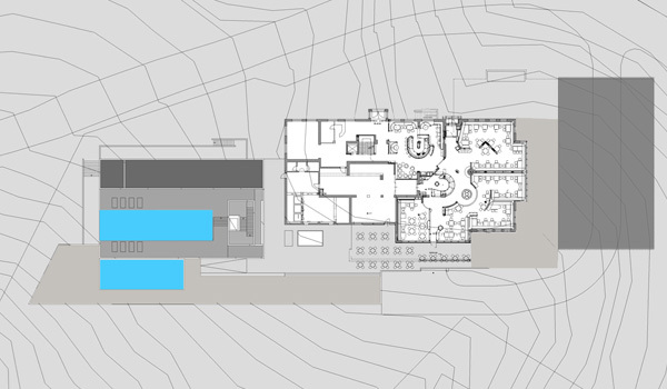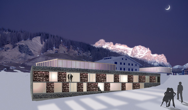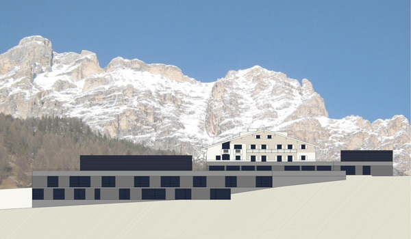Wettbewerbsentwurf, 2.Preis, für ein privates Ferienhotel im Grödner Tal. Umfang: ca.30 Zimmer, Spa-Bereich, Restaurant, Bar