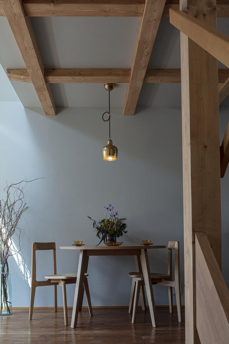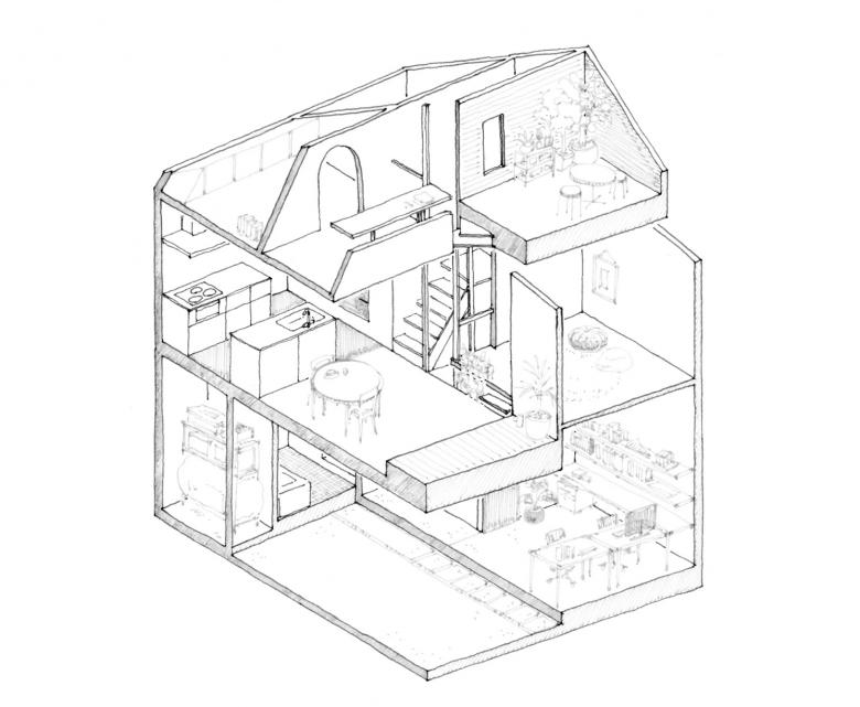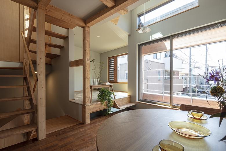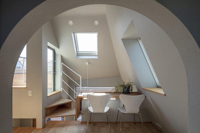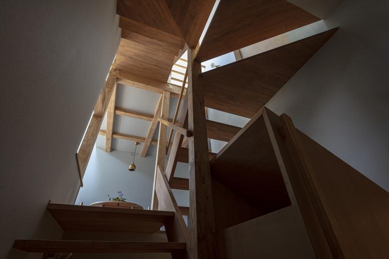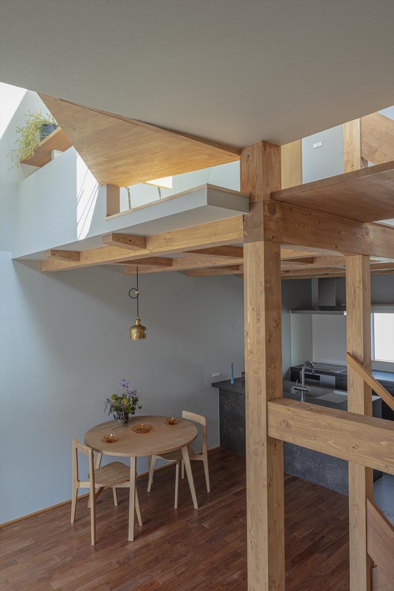 敷地に目一杯のボリュームを立ち上げた上で内部空間を立体的に構成することにより、適度に視線が抜け、光や風を通し、明るく変化のある場を生み出している。