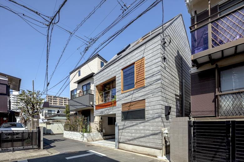 住宅密集地のなか、T字路に面して建つ仕事場付き住宅。