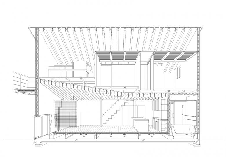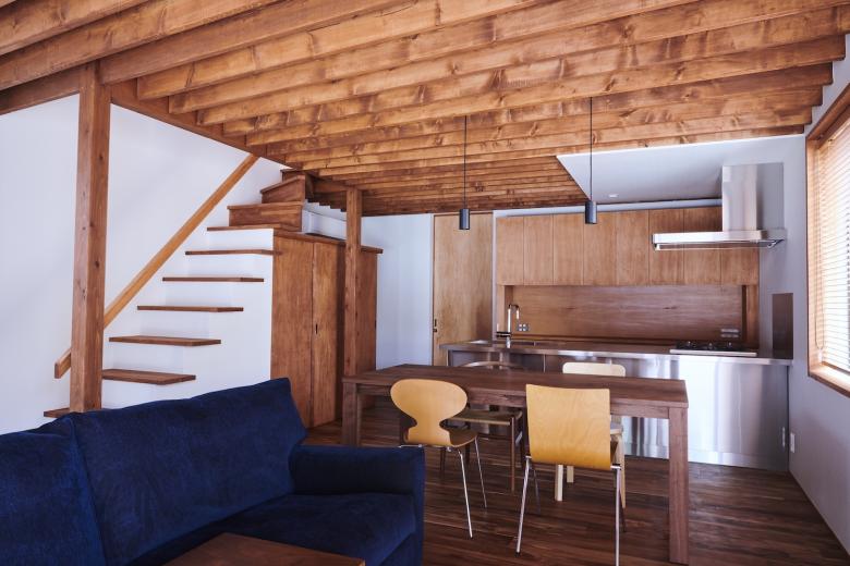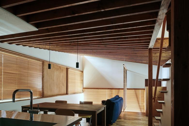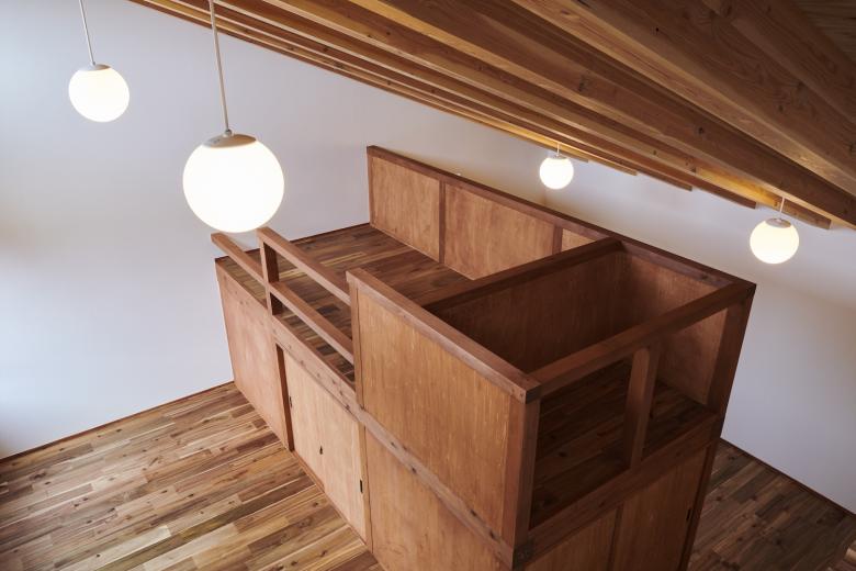 シンプルに必要諸室を配した長方形平面の二階建て、斜線規制にあわせた立面形状としつつ、1階と2階の間に木造HP曲面による構造床を挟み込んでいる。1階はその曲面あらわしの柔らかく落ち着いた空間とし、2階は各室の床に段差をつけて楽しい場所となることを意図した。