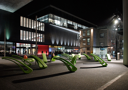 Der öffentliche Aussenraum bleibt entlang der Sihl durchlässig. Die schwierige Lage des von einer Autobahn überdeckten Flussraumes wurde bewusst in das Aussenkonzept aufgenommen und durch verschiedene Interventionen wie Kunst im öffentlichen Raum und eine öffentliche Ufertreppe aufgewertet.