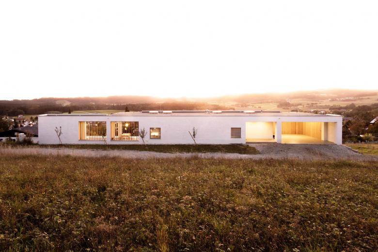 Die innere Raumabfolge entwickelt sich an einer Art Magistrale, wobei diese langestreckte Erschließungszone, gleichzeitig das Rückgrat der nach Süden orientierten Wohn,- und Lebensbereiche bildet. Von der Garage bis zum geschützten Außenbereich werden alle Raumfunktionen über diese interne Wegeachse erschlossen; - durch die Küche gelangt man direkt auf die geschützte Freiterrasse, die einen ungestörten Blick in die Landschaft freigibt.