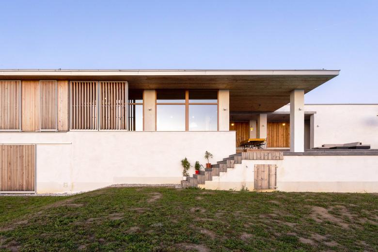 Begleitet wird das gesamte Erdgeschoß von Terrasse, Poolebene und Zugang zu Garten. Diese abgetreppte Terrassenlandschaft führt zu einer "Verlängerung" des Wohnraumes, wodurch die Grenze von Innen und Außen verschwimmt, bzw. Terrasse und Garten zu einem außenliegenden Wohnraum wird.