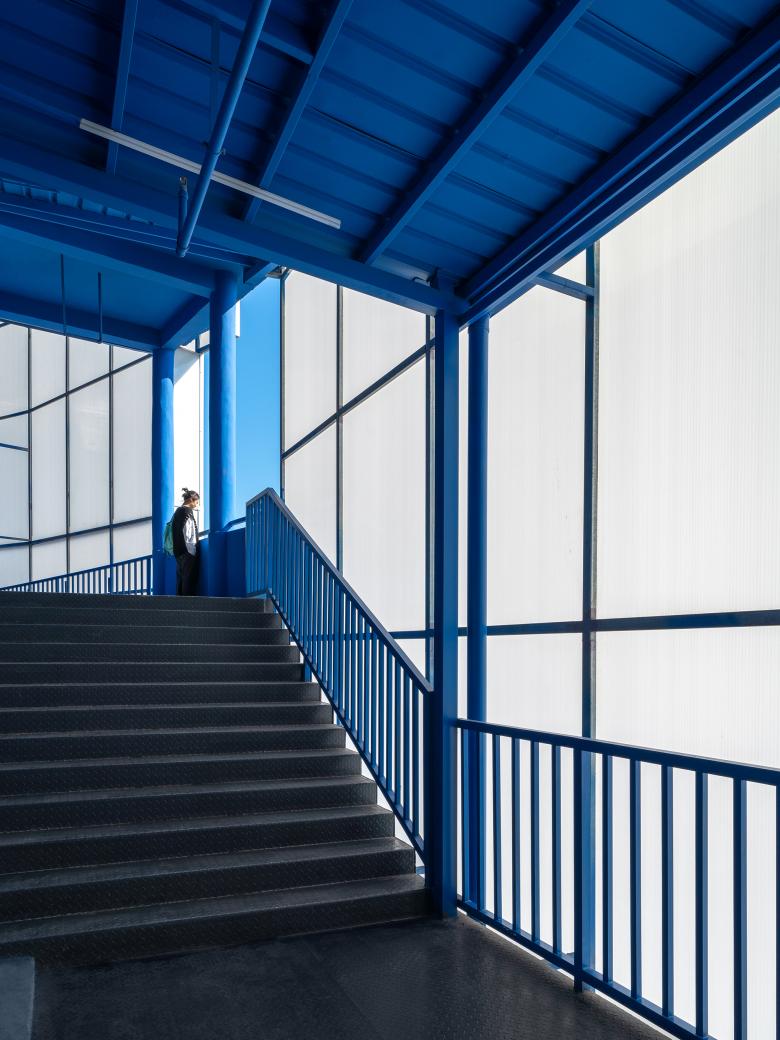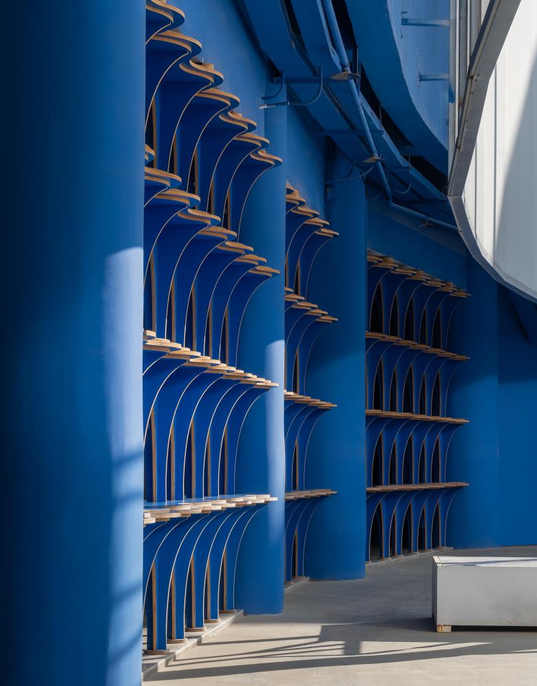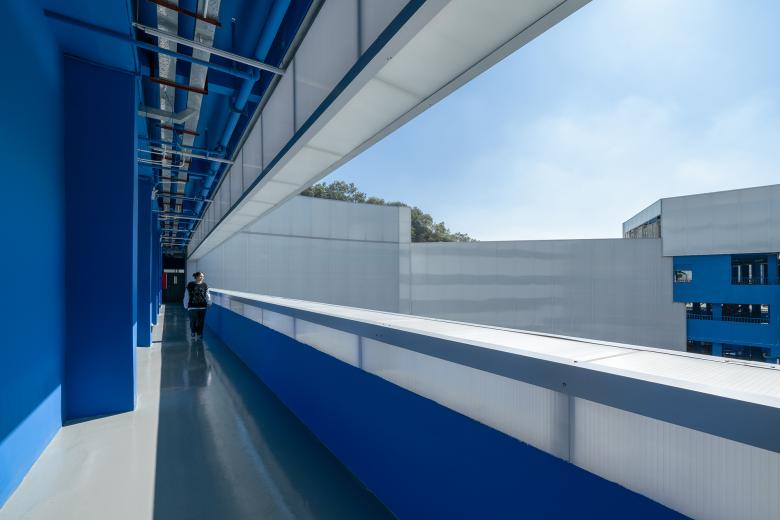 Newly added white materials and structures wrap the original building facades, which reconstruct the building volumes. The white structures form a strong contrast with the new blue wall coatings, together accentuating the neat, bright silhouette unique to the art school.