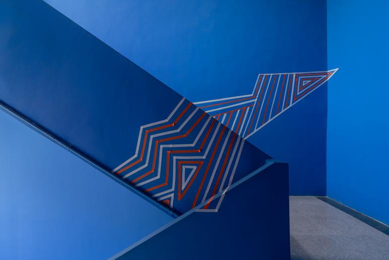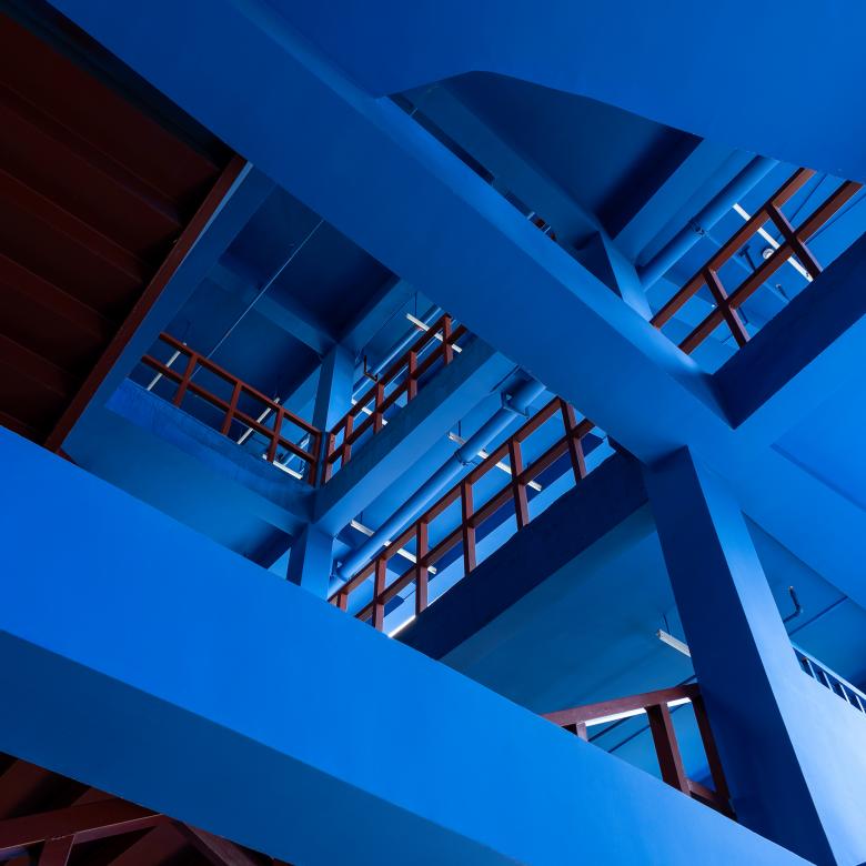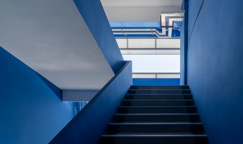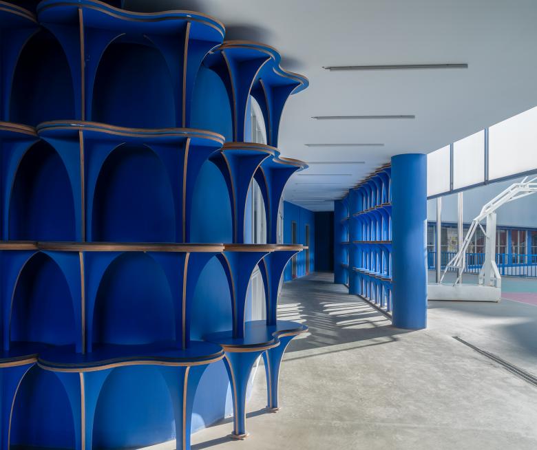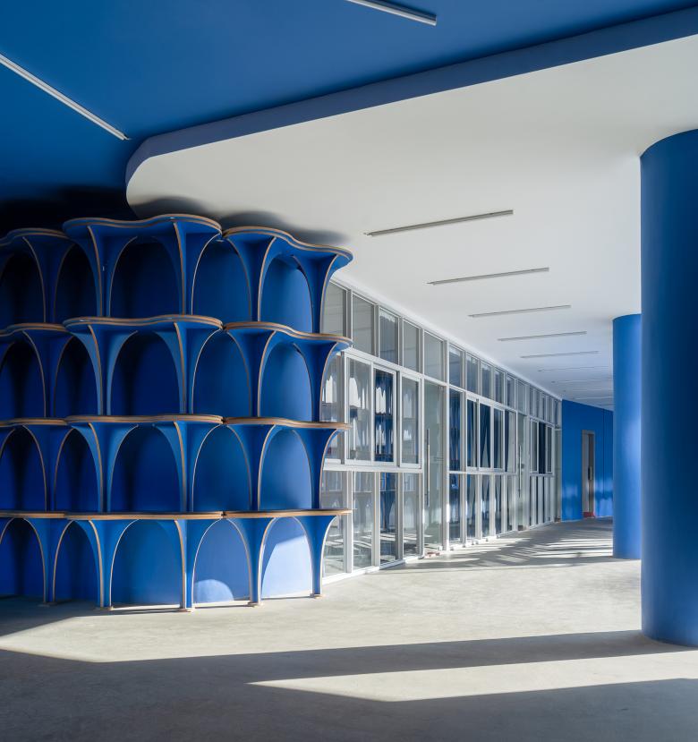 Vivid blue and pure white become a visual identity of the art school. The functional spaces are diversified and flexible, and a series of spacious fluid spaces become an extension of classrooms. Interior structures are finished in blue, while the brownish red stairs clearly highlight the vertical traffic.