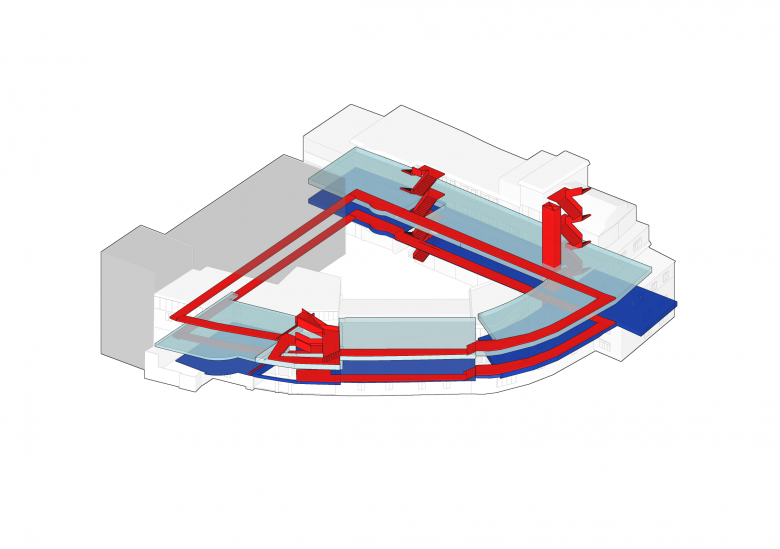 To meet the new functional requirements, the design team reorganized the traffic nodes between buildings and worked out reasonable circulation routes that connect buildings at different heights. The central area enclosed by buildings is turned into a sports field, while the original underground garage is converted into an open-air sunken auditorium.