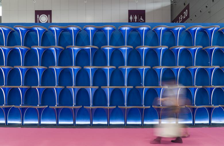 Each "Wave" is a modular table unit. Those modular units were quickly assembled and disassembled on the site of the exhibition, in a way that referred to traditional mortise-and-tenon joints and wooden furniture.