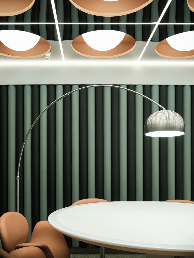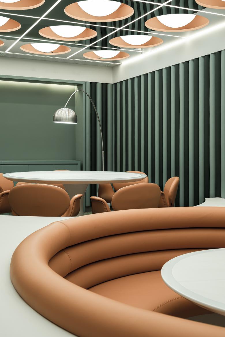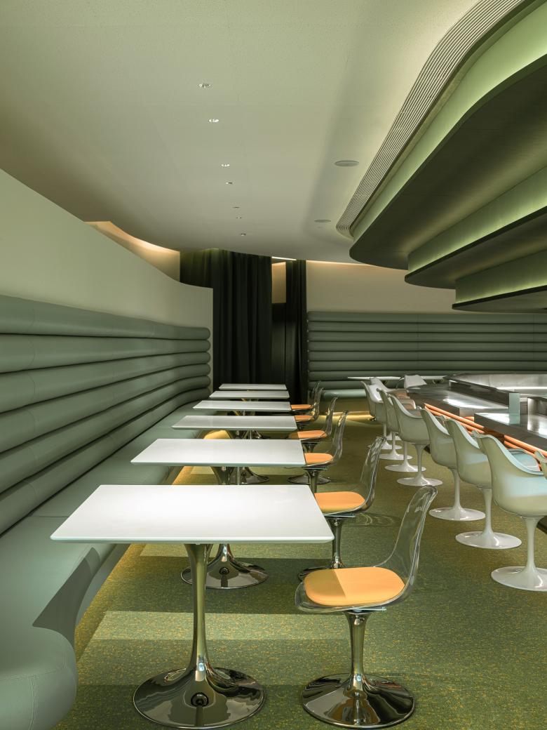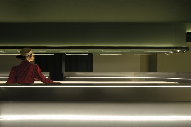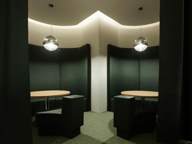 The space is dominated by a greyish green tone, which is a mixture of natural "green" hue and futuristic "grey" colour. Surfaces of different shades, malleable materials, film-like expressions and geometric compositions result in a tactile space.