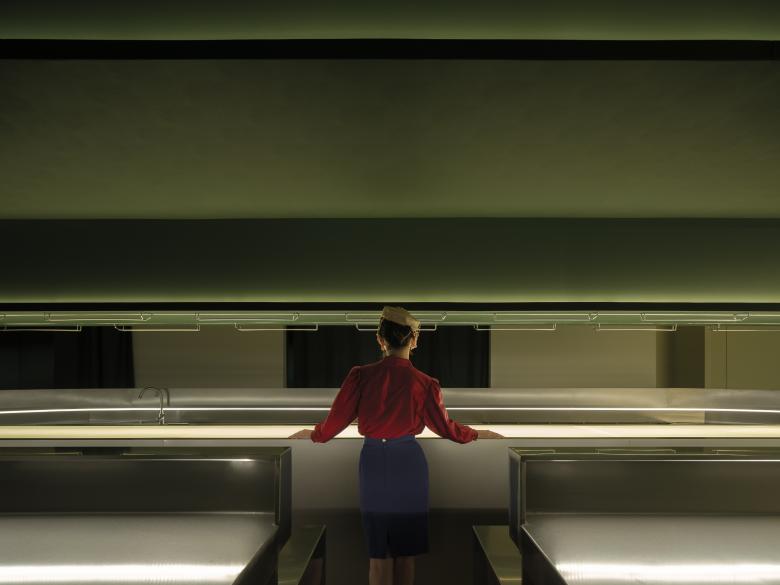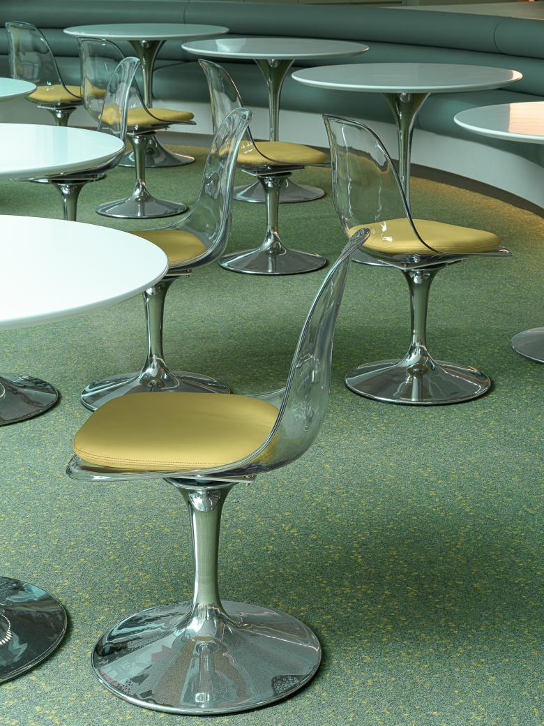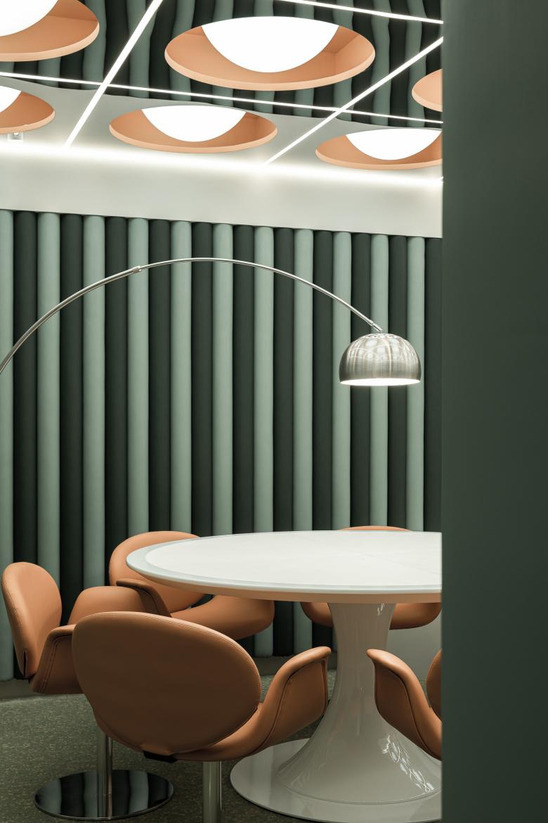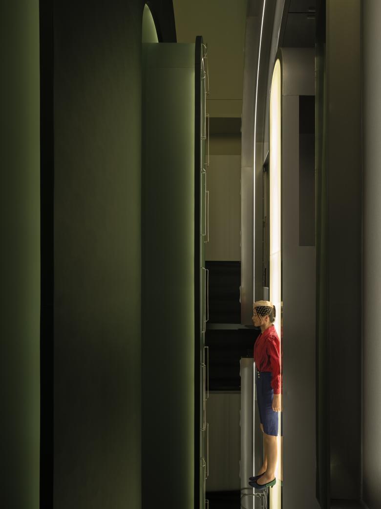 The space is dominated by a greyish green tone, which is a mixture of natural "green" hue and futuristic "grey" colour. Surfaces of different shades, malleable materials, film-like expressions and geometric compositions result in a tactile space.