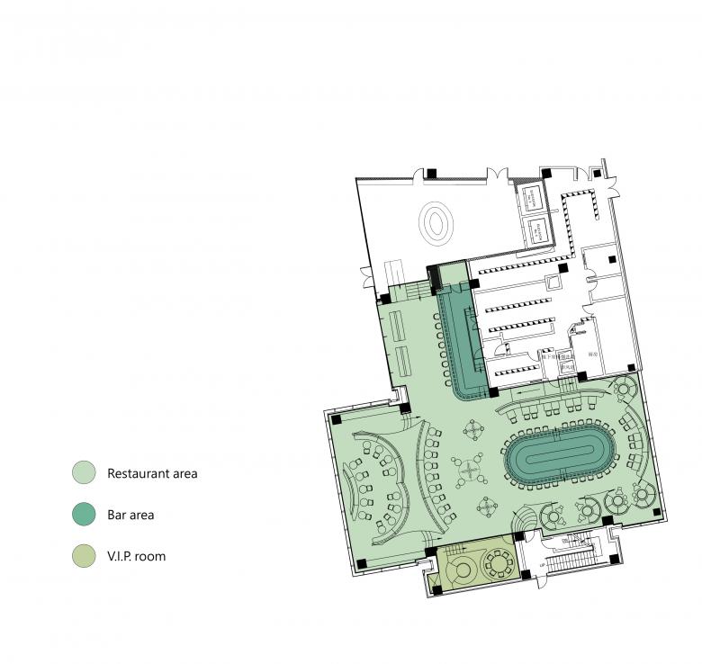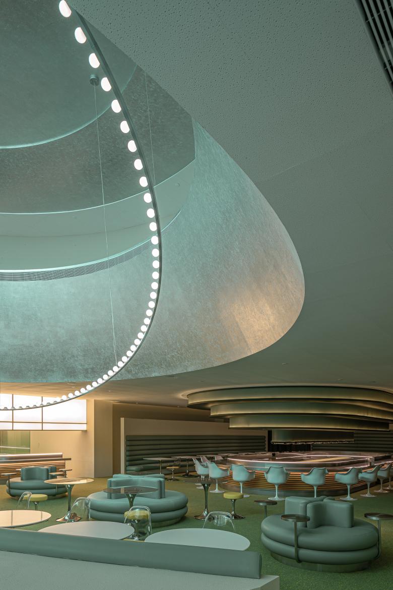 The ring "floating" in the atrium runs through the lower and upper areas. From the atrium to water bar, restaurant area, bar area as well as semi-open and private sections, the space is laid out based on different functions and degrees of privacy. With a smooth circulation, the entire space is able to accommodate 200 people for dining, relaxing and socializing. Various Associates incorporated the ideas of "waiting hall" and "countdown" into spatial scenes that rewind time, while also bringing in stories and creating spatial rhythms.