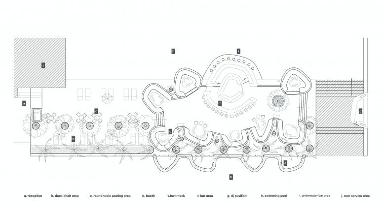 The natural coconut groves and the new structures are scattered around sunken booths. The new structures are connected to the ground through their "trunks" that naturally blend with the preserved plants. The expansive and naturally curvy "tree" canopies bring sufficient protection to the club's guests, while the space between each canopy unintentionally brings surrounding greenery into the view.