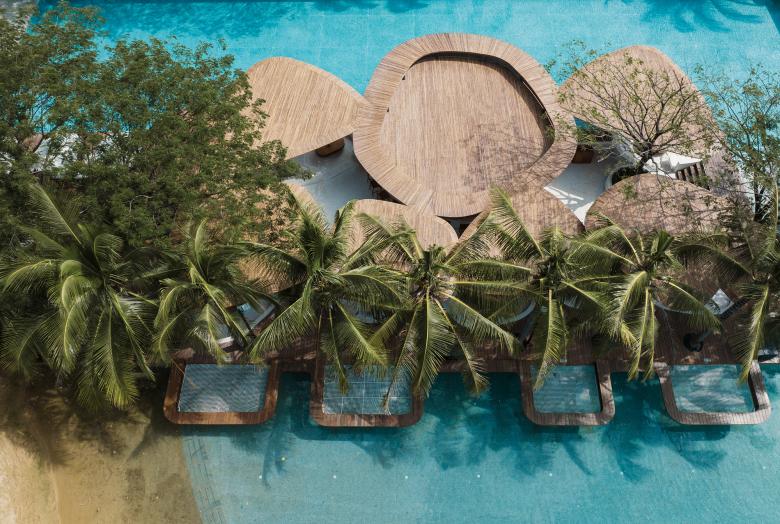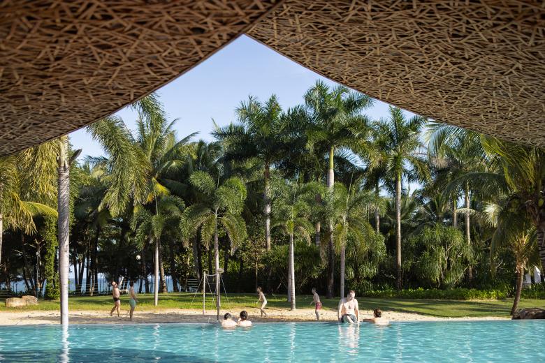 Through low-impact design interventions, the new structures blend with the existing landscapes and protected trees on the site, and echo the expansive, azure Haitang Bay across the coconut groves. The beach club "grows" from a site enclosed by the existing plants, which are the soul of the new space.