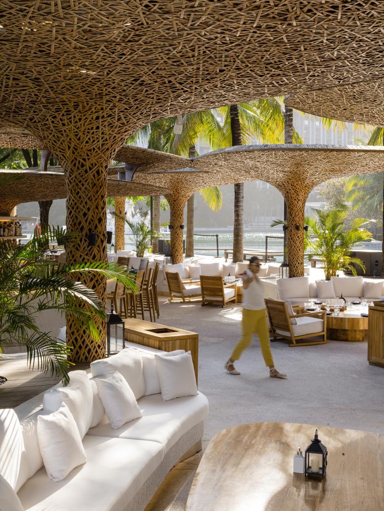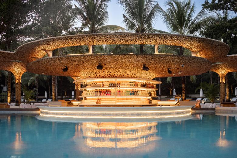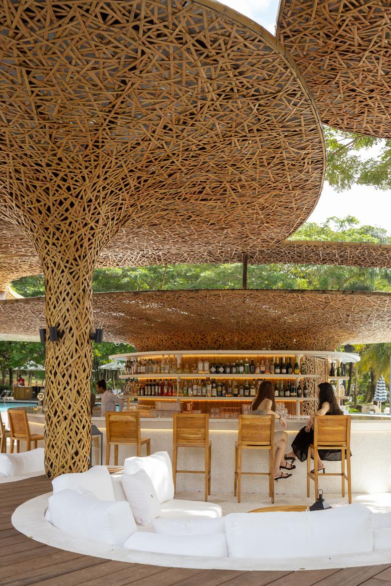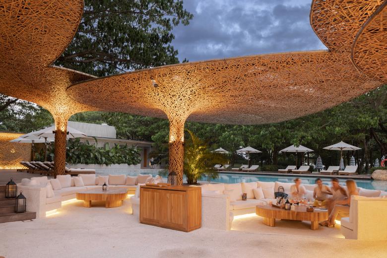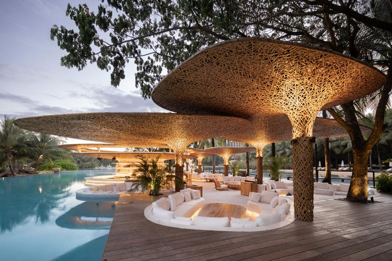 The unique color and texture of bamboo-woven structures are coupled with diffusing light to create a night vibe that the hotel appreciates, and add a touch of romance and warmth to the space.