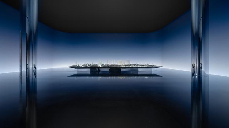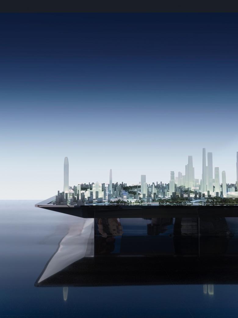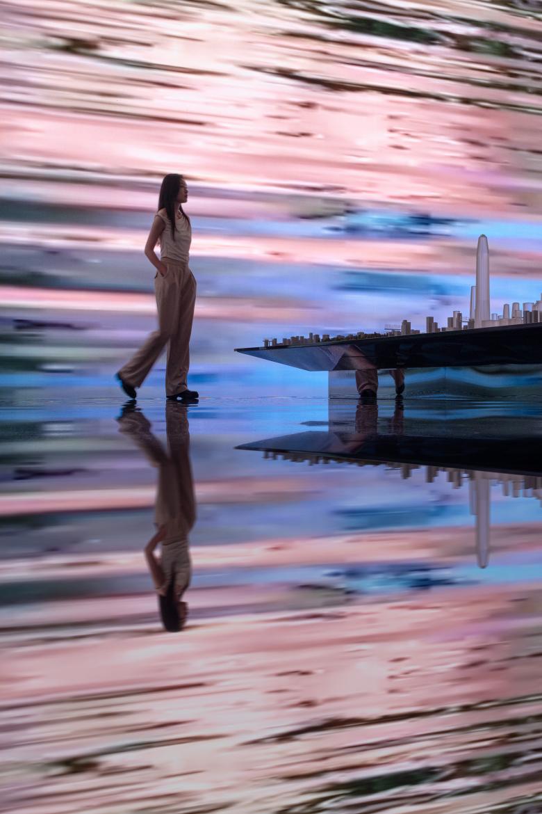 As the backdrop transitions into its static mode, the models of buildings unveil their most basic outlines against a gradient skyline. The clean and softened background enables visitors to concentrate their gaze, immersing themselves in an ethereal sense of the future within a boundless space.