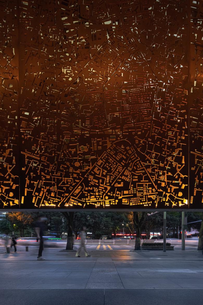 The design team aimed to convey an essential tension on the facade with a contrast of solidness and lightness. Anticipating challenges such as the impact of the internal structure on the hollowed-out patterns, and general issues in an elongated cantilever, such as wind resistance and potential material deformation, the team opted for casting techniques involving acrylic and hollowed-out metal to tackle these technical hurdles. The finished cantilevered external facade now stands as the first super-large craftwork in China, boasting a nearly 30-meter-long facade cast with acrylic, achieved without the use of any metal screws.