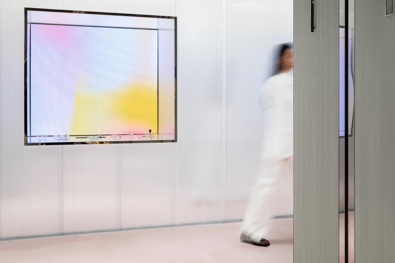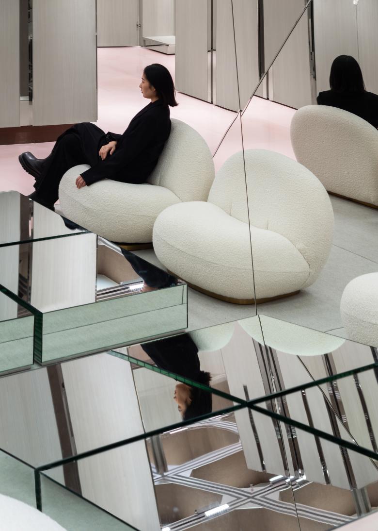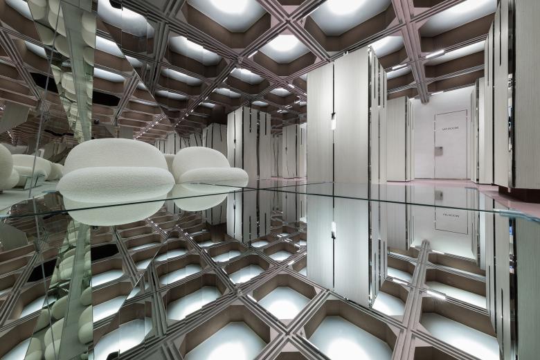 Slanting walls inside the entrance form a leisure and exhibition area that are available to display perfume, artworks and so on. Mirrors reflect the hazy lighting on the ceiling and create a multidimensional dreamy space, which blurs the boundary between the real and the illusionary and provide immersive spatial experiences.