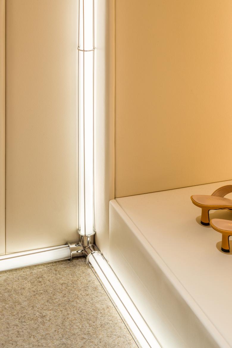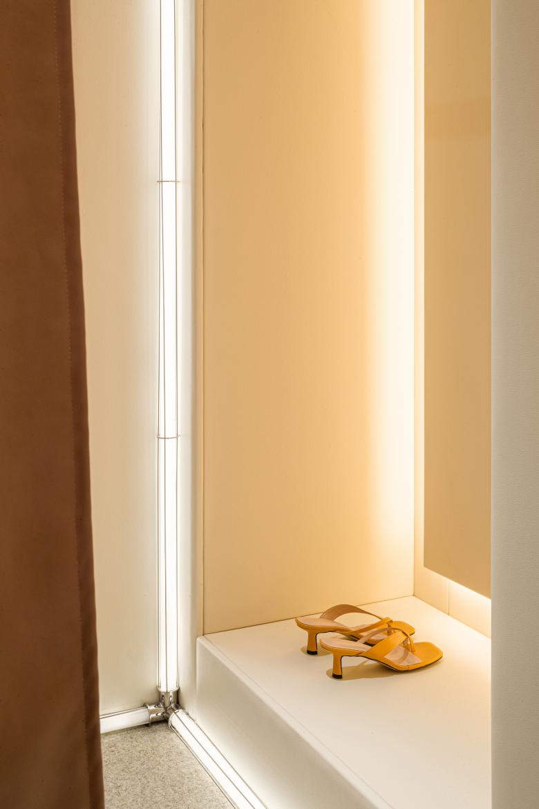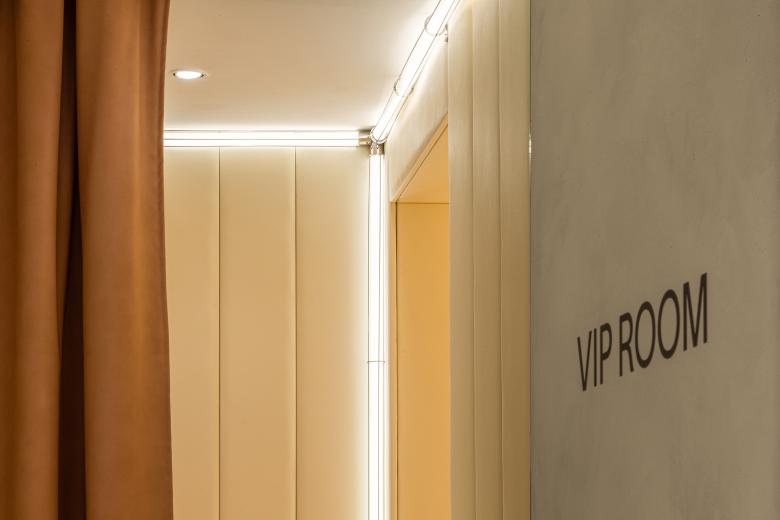 The hidden VIP fitting room features an atmosphere totally distinct from the outside. The warm yellow tone and ethereal lights accentuate spatial lines, and produce exquisite visual effects as well as a comfortable, warm and elegant ambience.