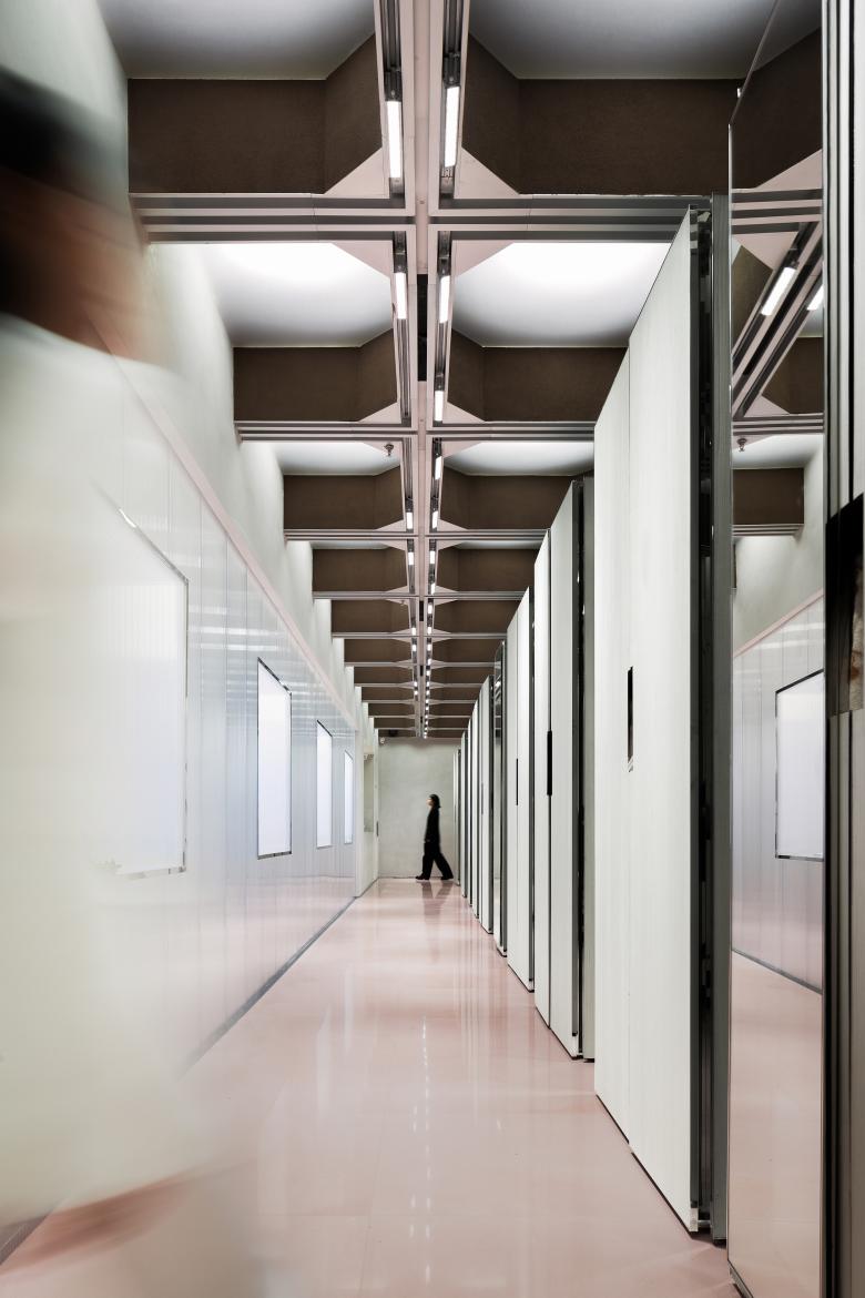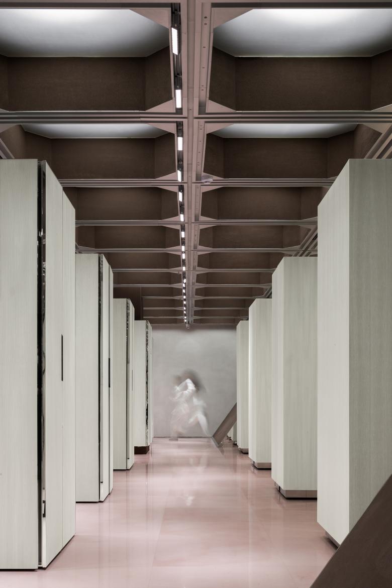 The ceiling is characterized by a sense of order and a structural aesthetic. It hides complex systems behind, including lighting, fire prevention system, and cabinet moving tracks, which are coordinated and integrated into a whole. This area is filled with tranquil shadows and soft lights. It presents an enchanting scene where misty moonlights are reflected on rippling water surface.