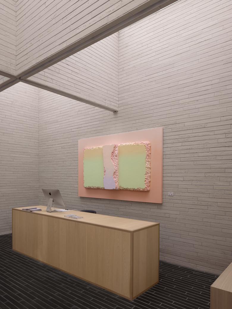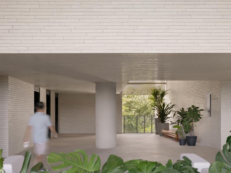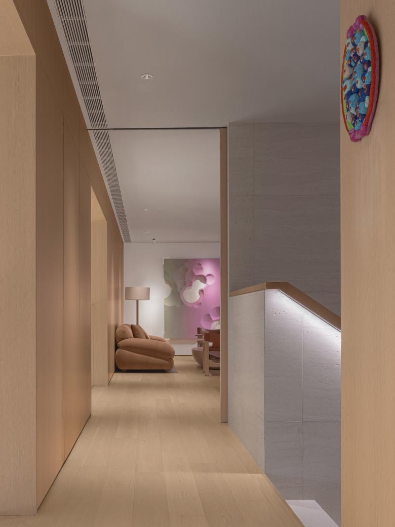 The end of the passageway serves as an intersection of the circulations for the lounge area, elevator hall, and artist-in-residence rooms. The circulations guide the way naturally through height variations, creating a harmonious transition.