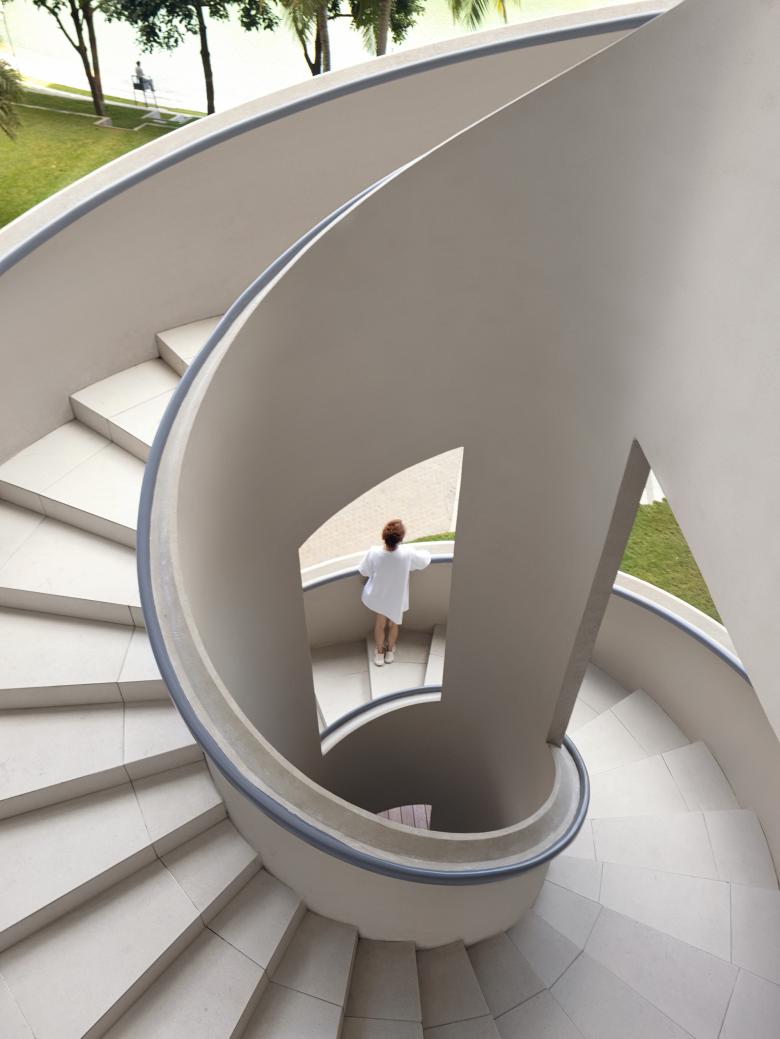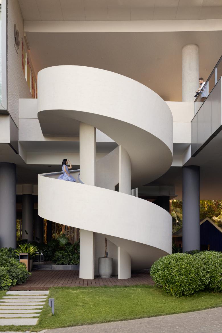 The spiral staircase is crafted with an elegant curved design language, echoing the flair of an art gallery with its pure form. When ascending the pure white steps, visitors are treated to a breathtaking panoramic view of the stunning tropical landscape, making this spot one of the sought-after instagrammable attractions for tourists.