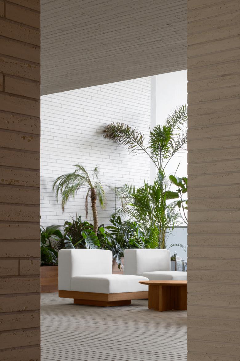 The materials present the natural and authentic textures. The design team cut the travertine tiles into smaller pieces and applied them throughout the space, producing a cultural ambiance and a sense of place through the simple texture and its extending form.