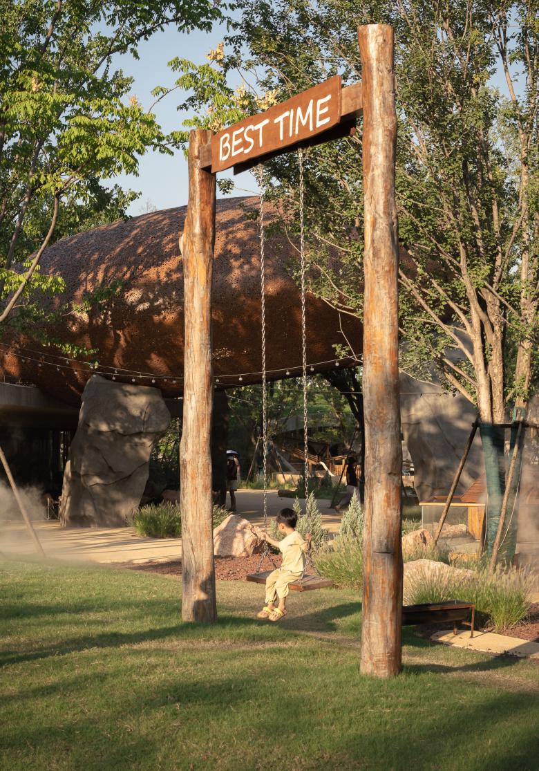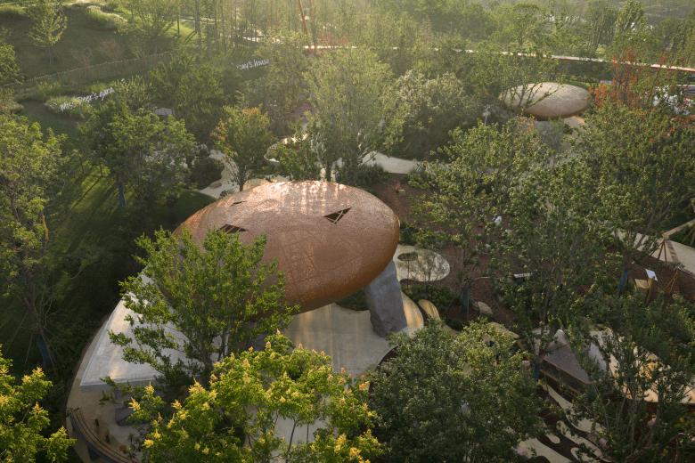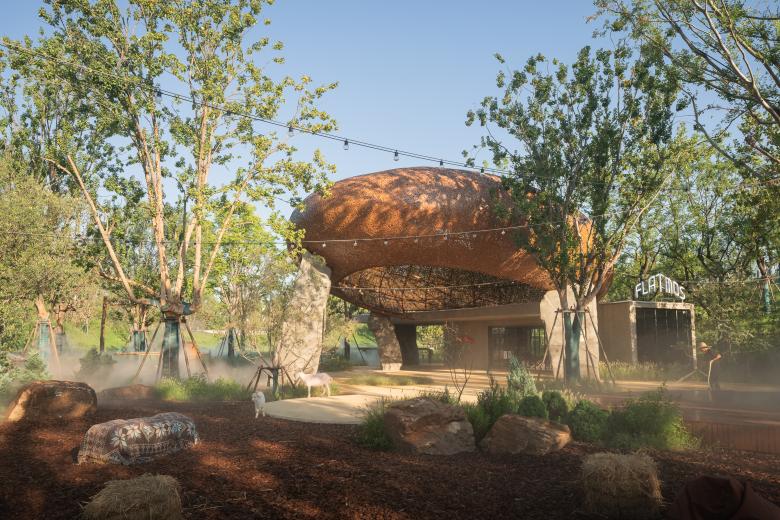 A second dessert station, shaped like a UFO with a cantilevered metallic canopy, exudes a striking sense of futurism. In contrast to the earthy tones elsewhere, its sleek metallic form serves as a visual landmark and directional cue within the site.