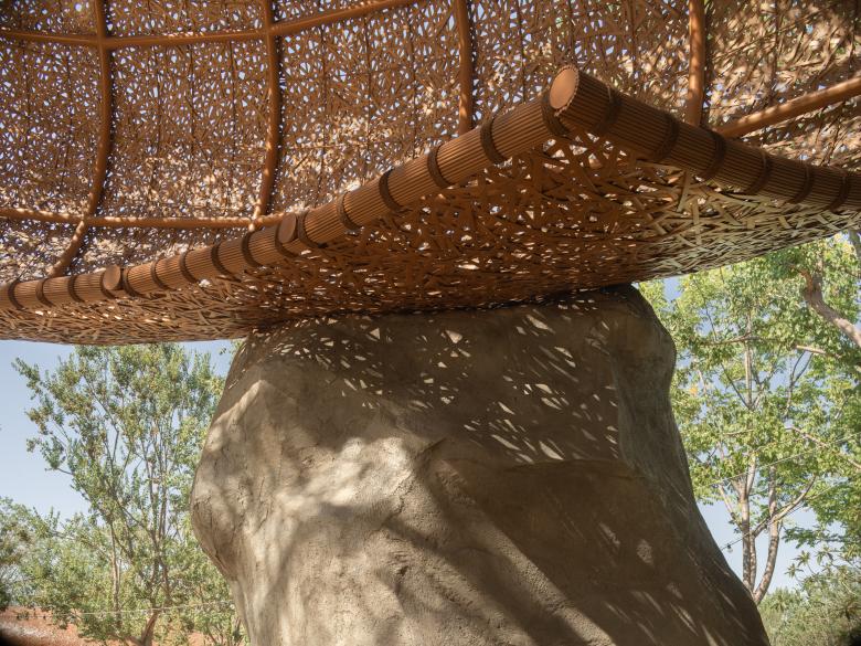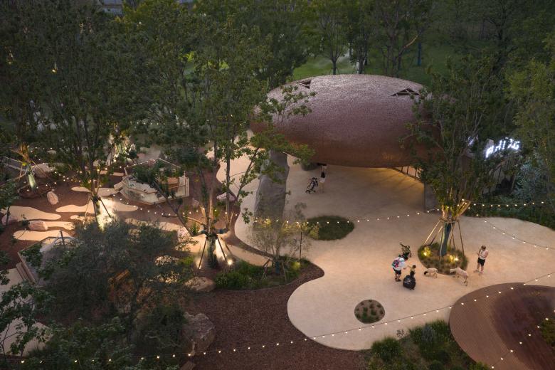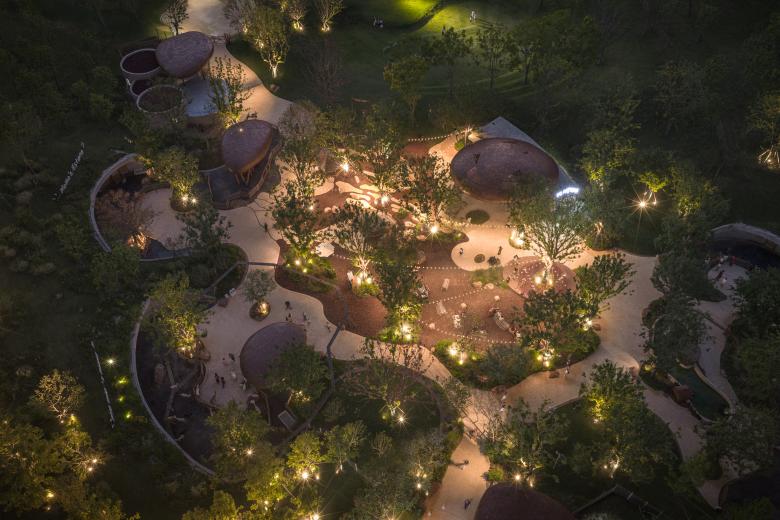 Triangular cut-outs in the bamboo dome scatter dynamic patterns of light and shadow. As a key social hub, this space serves as both a resting stop and a café. The open courtyard extends into the surrounding greenery, cultivating a a relaxed, artisanal atmosphere.