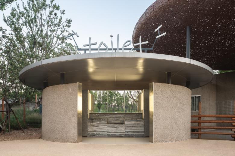 Grouped as a pair, the feed barn and washroom are topped with bamboo-and-metal roofs that float with sculptural lightness. The functional washroom is crafted with a sculptural language: a stone-and-metal-clad entrance leads into an interior finished with cement-based artisanal coatings and textured tiles, creating a clean and atmosphere.
