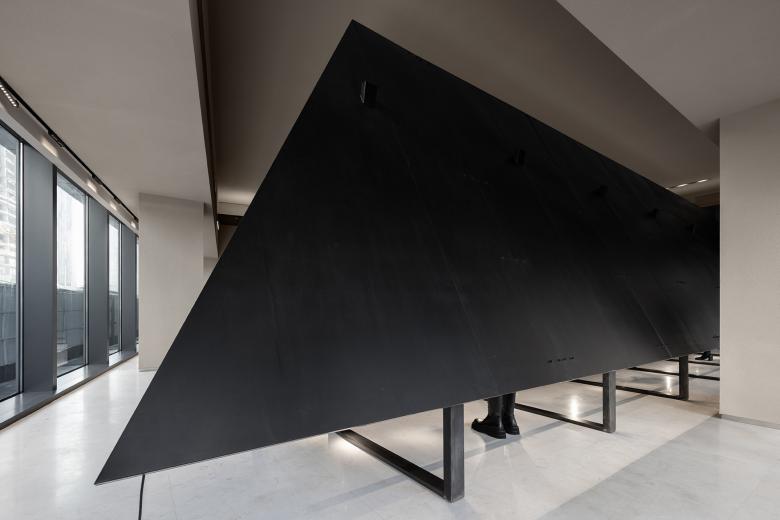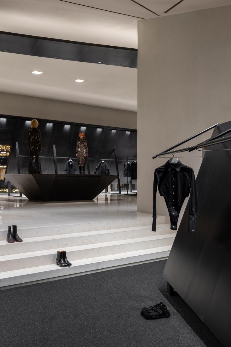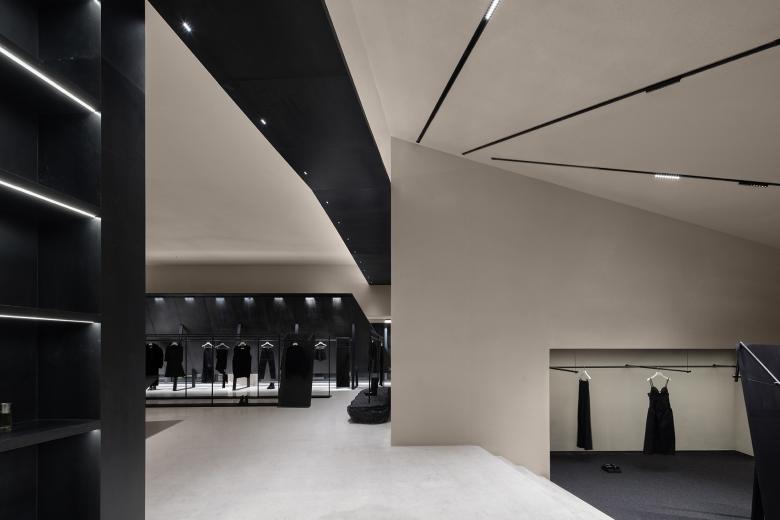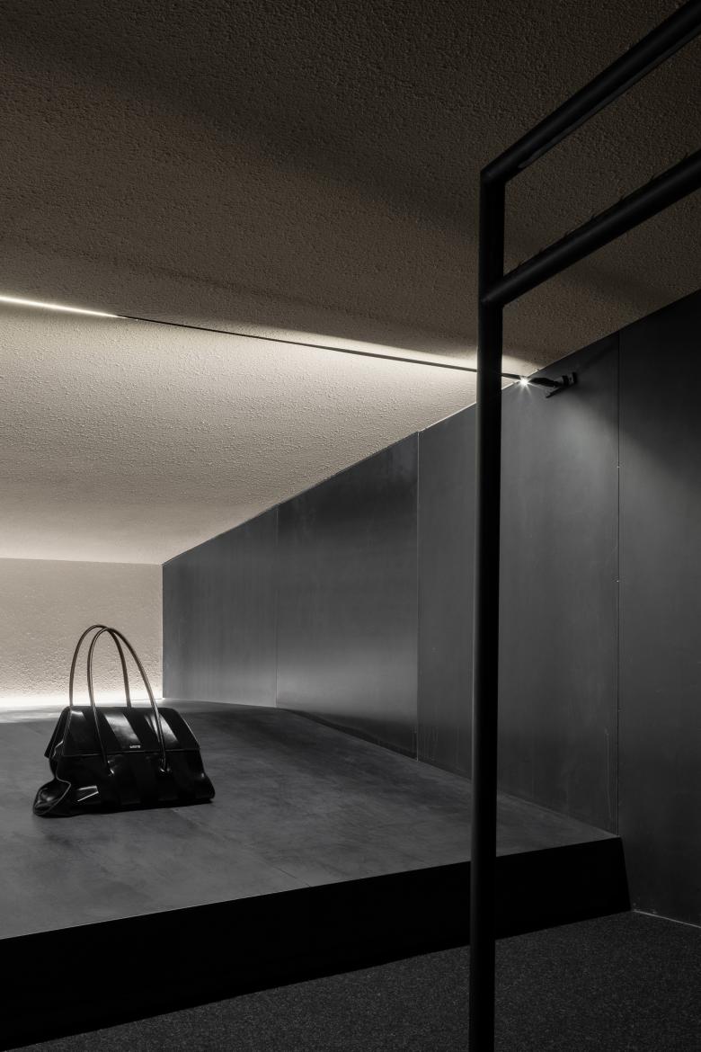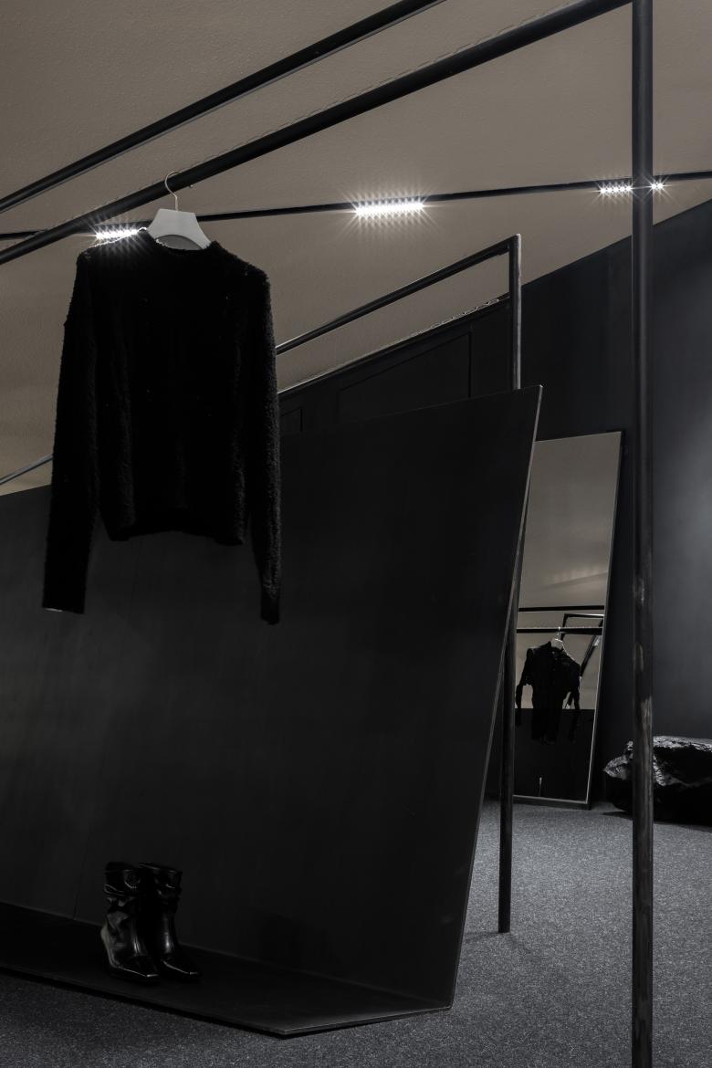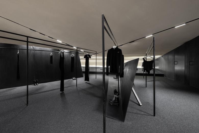 The use of iron bars is an extension of the geometric design employed in SND's first store in Chongqing. Display fixtures inspired by raw iron materials are placed throughout the space, creating a striking contrast between black metal and the quiet color backdrop. The use of organic, non-square shapes generates a dynamic tension within the monochrome space, achieving a balance between power and aesthetics.