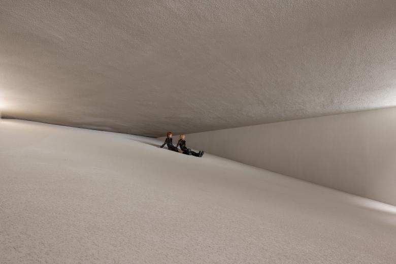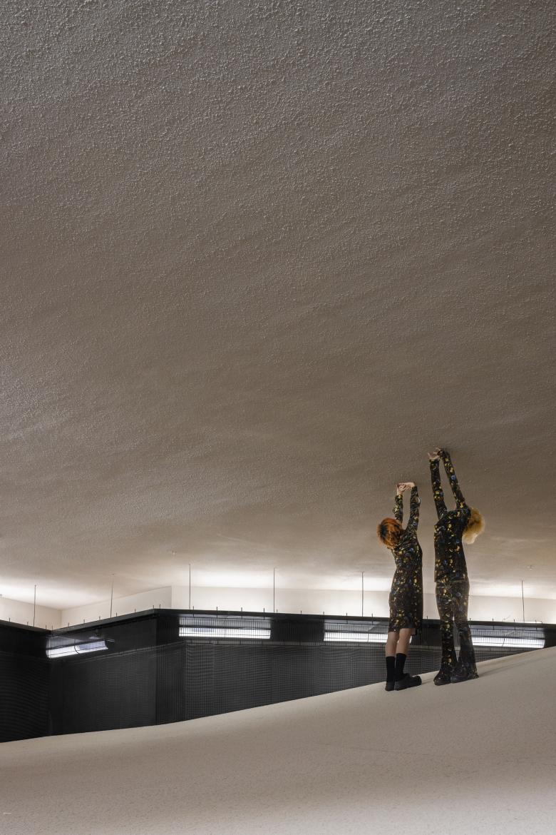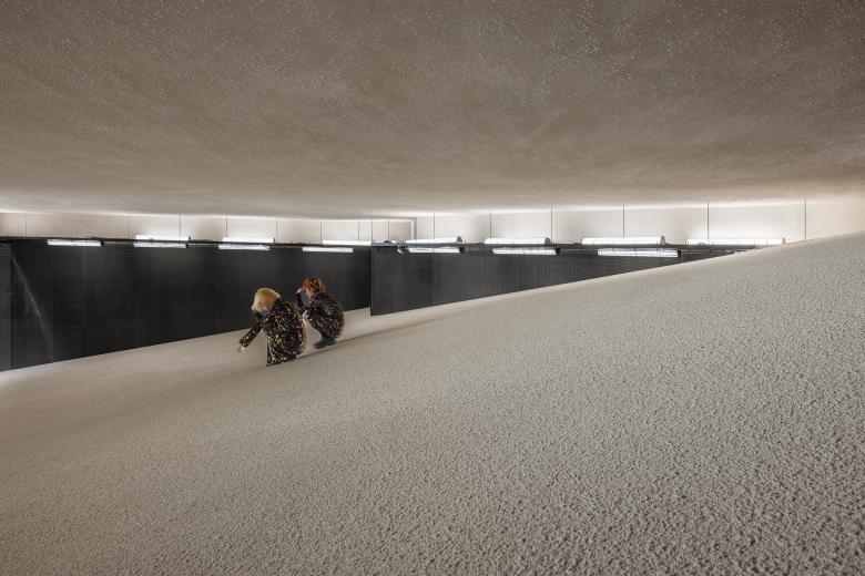 The design team's main focus was to craft a distinctive spatial encounter within an already-existing building. By making use of the existing floor height, they managed to obscure the main retail area beneath the dune and create a large-scale structure that results in an immersive and profound atmosphere reminiscent of ancient times.