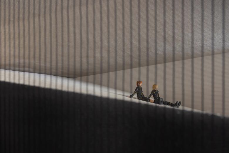The black path on one side of the dune resembles a deep mine. Bright mining lights illuminate the way and guide explorers to discover hidden treasures beneath the sand. As visitors turn back, the steel grille offers glimpses of the dune's light and shadows.