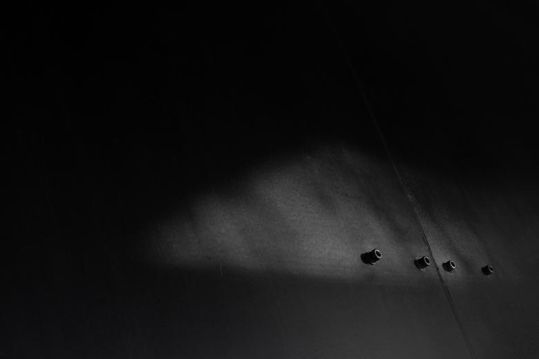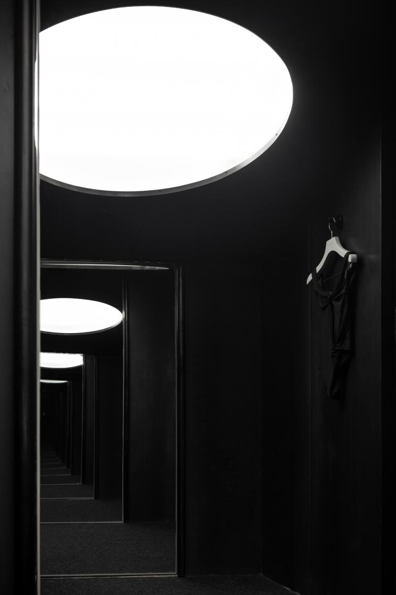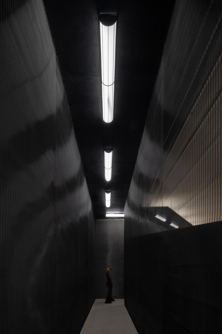 The interplay of bright light and deep shadow creates a sacred and private runway for the fitting rooms located beneath the mountain, as if illuminated in bright moonlight.
