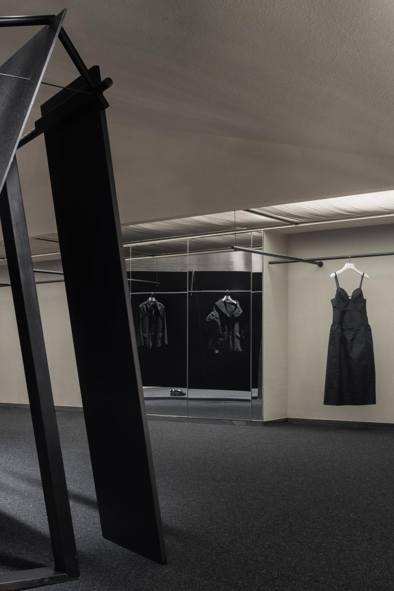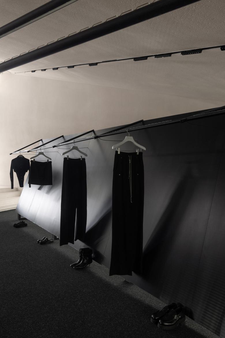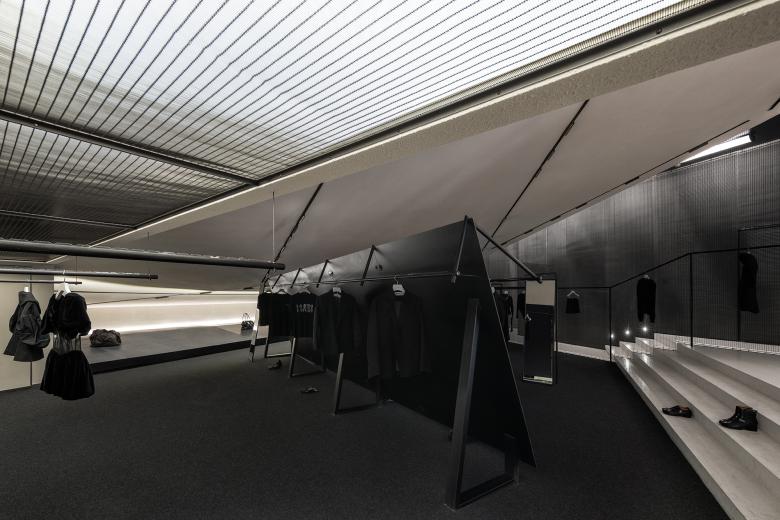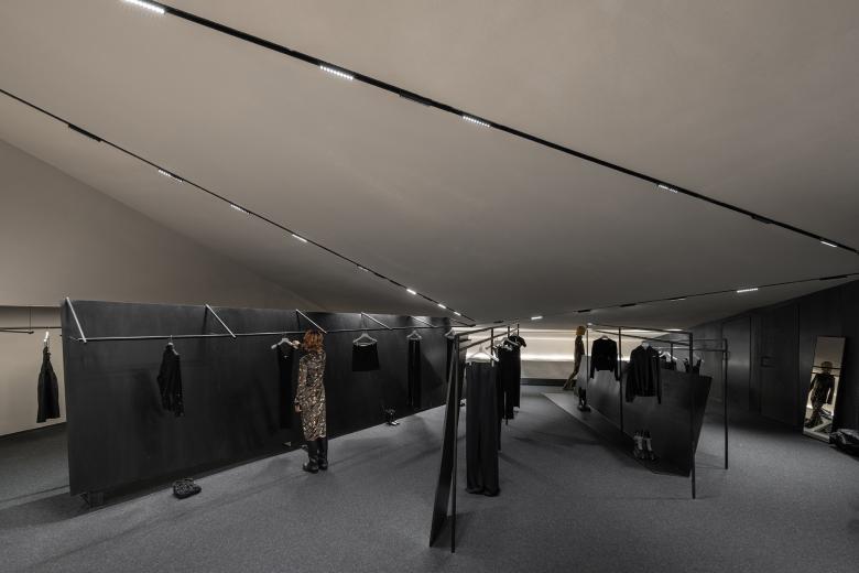 The innovative lighting system brings the black-and-white space to life through the play of light and shadows. Focused lighting accentuates the textures of the fabrics, while diffused lighting reveals the expansive nature of the space. The versatile lighting arrangement creates endless possibilities for the retail space.