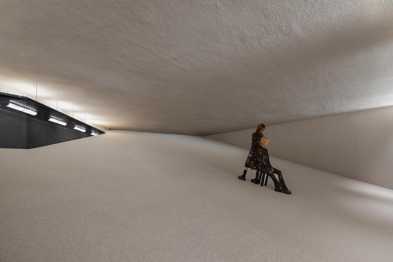 A grand, immaculate dune evokes an otherworldly atmosphere, detached from the modern world and providing a serene escape from the urban chaos. It creates a pristine white stage against a pitch-black backdrop, displaying the collections of clothing like precious treasures and luring visitors to embark on an exploration.